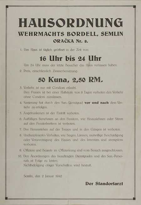 Very rare and provocative poster, the printed rules for a bordello operated by the Wehrmacht, located very close to a notorious Jewish camp in Nazi-sympathetic Croatia. The poster measures 10" x 14 1/2" and was folded at one time, most likely by a German soldier who kept it as a souvenir of sorts. The poster bears large type at top: "HOUSE RULES WEHRMACHT BORDELLO SEMLIN ORACKA #8", along with its hours of operation, 1600 to 2400. It also notes that the price, inclusive of room charge, would be 2.5 RM. Among the rules listed: "intercourse allowed only with a condom...women having intercourse without use of condoms will be incarcerated for eight days...proper washing is required before and after intercourse...intoxicated people are not allowed...inappropriate behavior at windows, including leaning outside windows or sitting on window ledges, is forbidden...singing, making noise, vandalism of the building or its contents is forbidden...officers are excluded from visiting...". It is signed in type by a local military doctor and dated Jan. 2, 1942. Semlin is a outlying section of Belgrade, presently part of Serbia. Following the surrender of Yugoslavia in April, 1941, Semlin, along with the rest of the Syrmia region, was given to Nazi ally, Croatia. The town became the site of the Semlin Judenlager, a ghetto housing the Jewish women, children and elderly who were not held as hostages in reprisal shootings. Wehrmacht and SS soldiers were stationed there as well, guarding the Jews housed in a vacant exhibition grounds, and in town as it was a key border crossing between Croatia and Serbia. Only fifty Jewish women survived their imprisonment - over 7,000 were dispatched in notorious "gas vans". The Judenlager at Semlin was located only about one-half mile from the brothel from which this poster was pilfered. Of course, the German armed forces maintained brothels throughout Europe, largely staffed by prostitutes who had plied their trade before the war, and were forced to continue in business but working for a mere pittance, most often under duress and in extreme poverty. This is the first such poster we have encountered, and it is particularly horrifying when one considers the "customers" who visited the establishment.