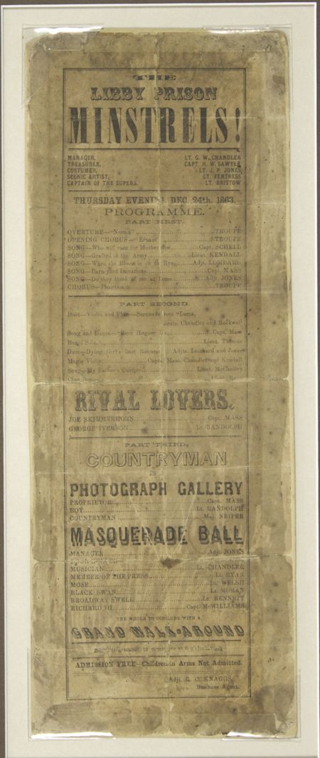 An excessively rare printed broadside, a playbill for an 1863 Christmas stage show undertaken by imprisoned Union officers at Richmond's notorious Libby Prison! The playbill measures 6" x 15 3/4", advertises the Dec. 24, 1863 performance of "The Libby Prison Minstrels!". All of the performers are officers and listed by rank and last name only. The show included a series of songs including "Who will care for Mother Now" and "Do they think of me at Home", a skit entitled "Rival Lovers" as well as a "Masquerade Ball" and "The Whole to Conclude with a Grand Walk-Around". With a cheeky notice at bottom: "ADMISSION FREE -- Children in Arms Not Admitted". Heavy folds, some which appear weak, moderate toning and soiling, else good condition. Obviously, this performance was not for viewing by the citizens of Richmond, who detested the Yankee invaders, but rather for fellow inmates. We find it incredible that despite the enormous hardships faced by the prisoners at Libby - indiscriminate shootings, starvation, beatings, and so on - they retained enough morale to put on a Christmas revue! Neatly matted and framed.