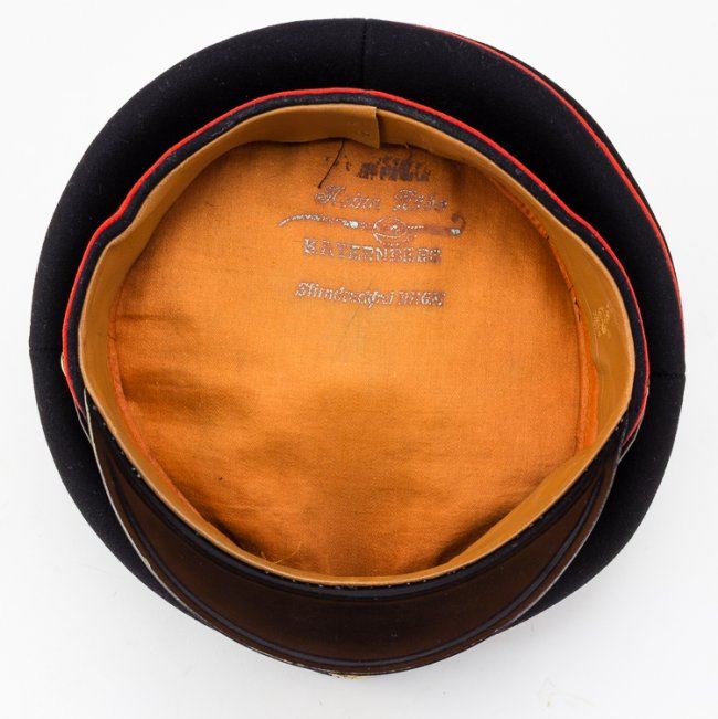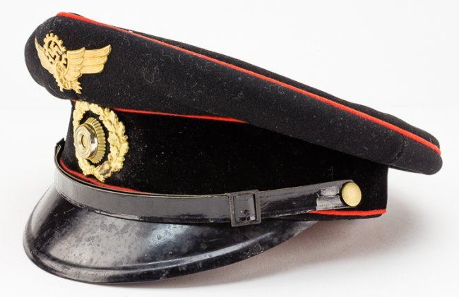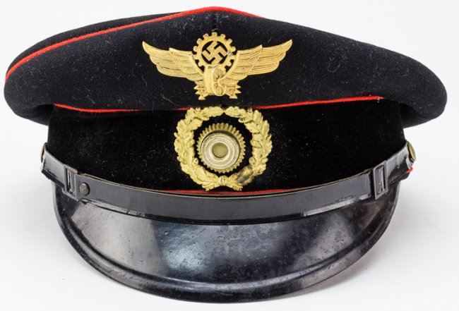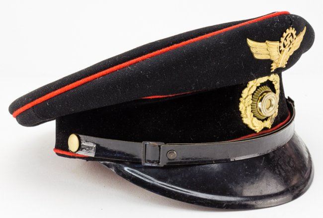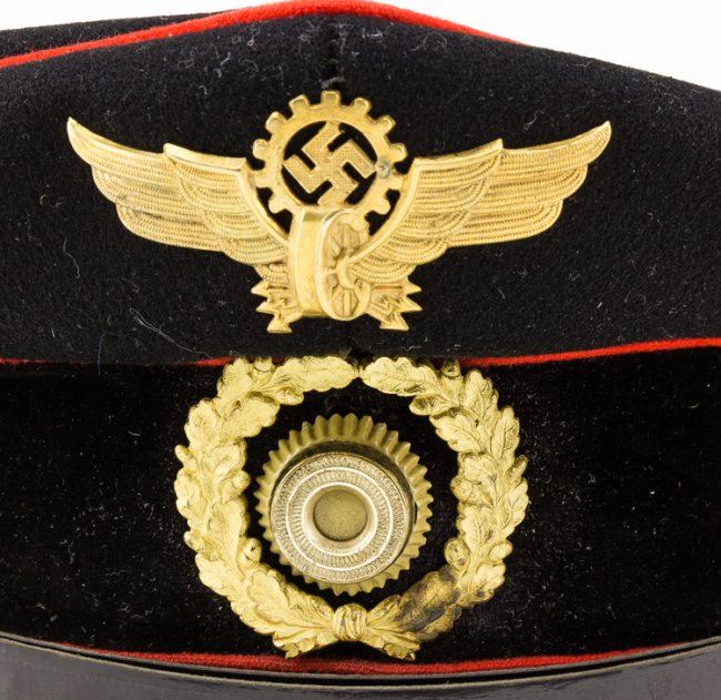 Scarce "Privatbahnen" visor cap, worn by an employee of any railway in Germany not controlled by the federal government, including connector lines and commuter lines. This peaked cap has a midnight blue body and black side band, all piped in red. At front is a gold-toned pin showing wings, a railway wheel, swastika, and arrows, beneath which is a gold metal cockade surrounded by gold laurel leaf wreaths. A black patent leather chin strap is attached to gold buttons just above a black celluloid visor. Within is a leather sweatband with light orange liner bearing the maker's gold imprinted name and city: "Heinz Ruhe Katernburg". Near fine condition.