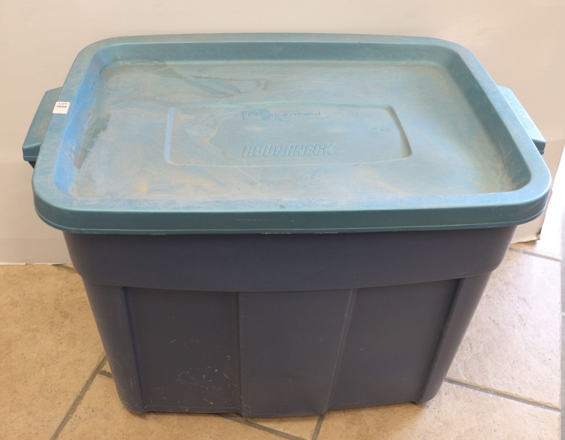EMPTY RUBBERMAID ROUGHNECK TOTE, 18 GALLON, 24" X 16" x 16.5". LID INCLUDED BUT DIFFERENT COLOUR THAN TOTE