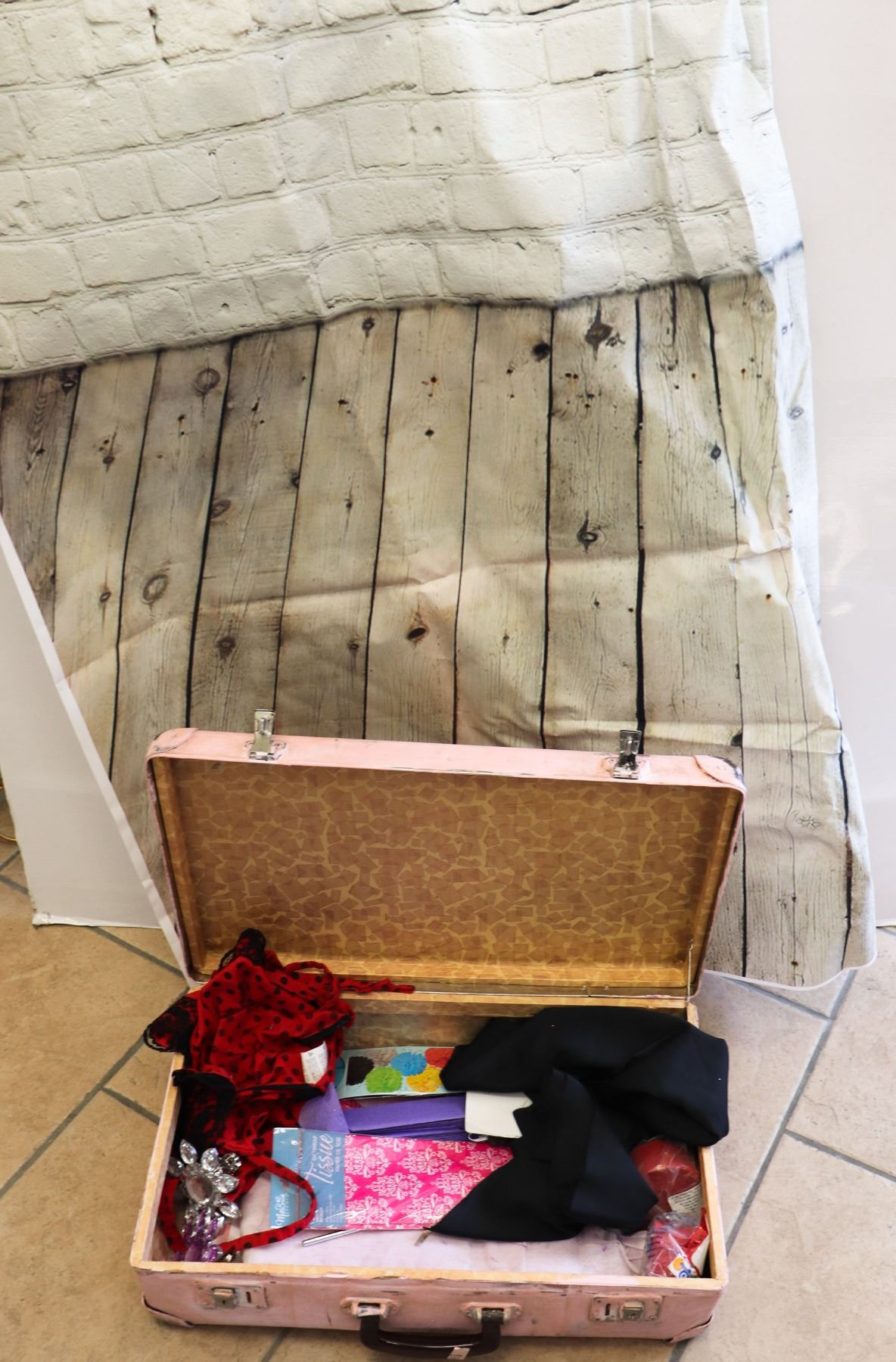VINTAGE SUITCASE FULL OF PHOTO PROPS AND PHOTO BACKGROUND