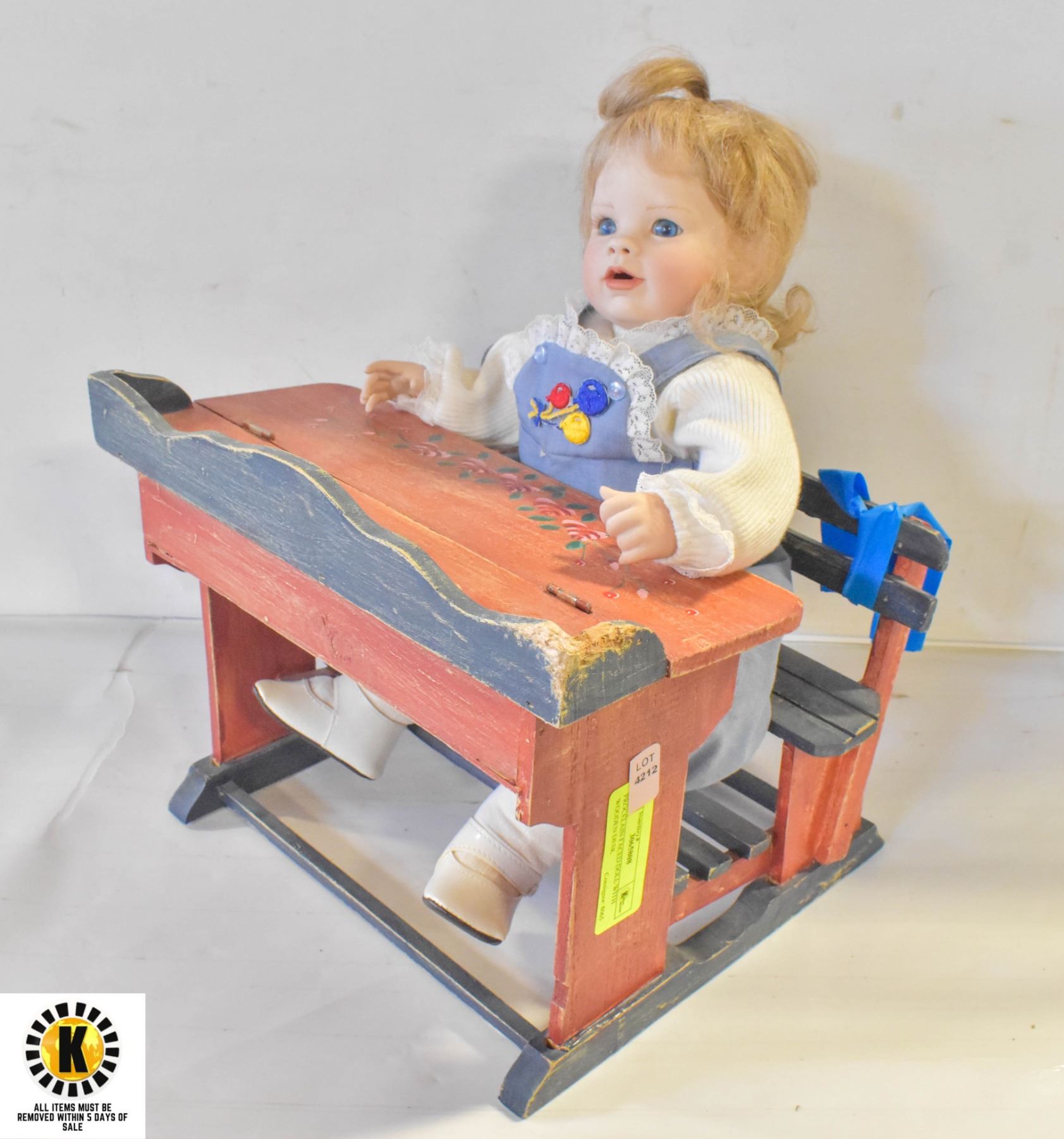 PROCELAIN FACED DOLL WITH WOODEN DESK