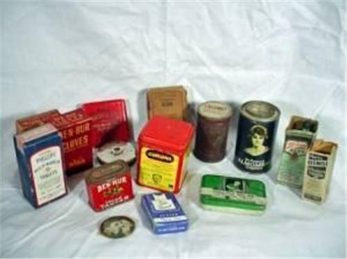 PRODUCT TINS WITH PRODUCT REMAINING IN CONTAINING INCLUDING TINS AND CARDBOARD ITEMS SUCH AS MURINE, BEN HUR TARTER, AND MORE.