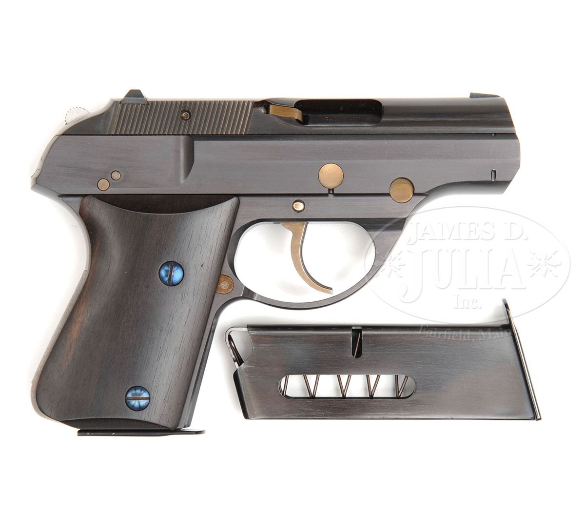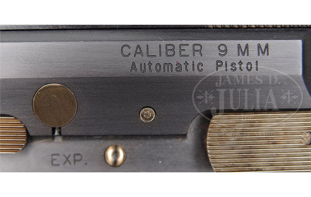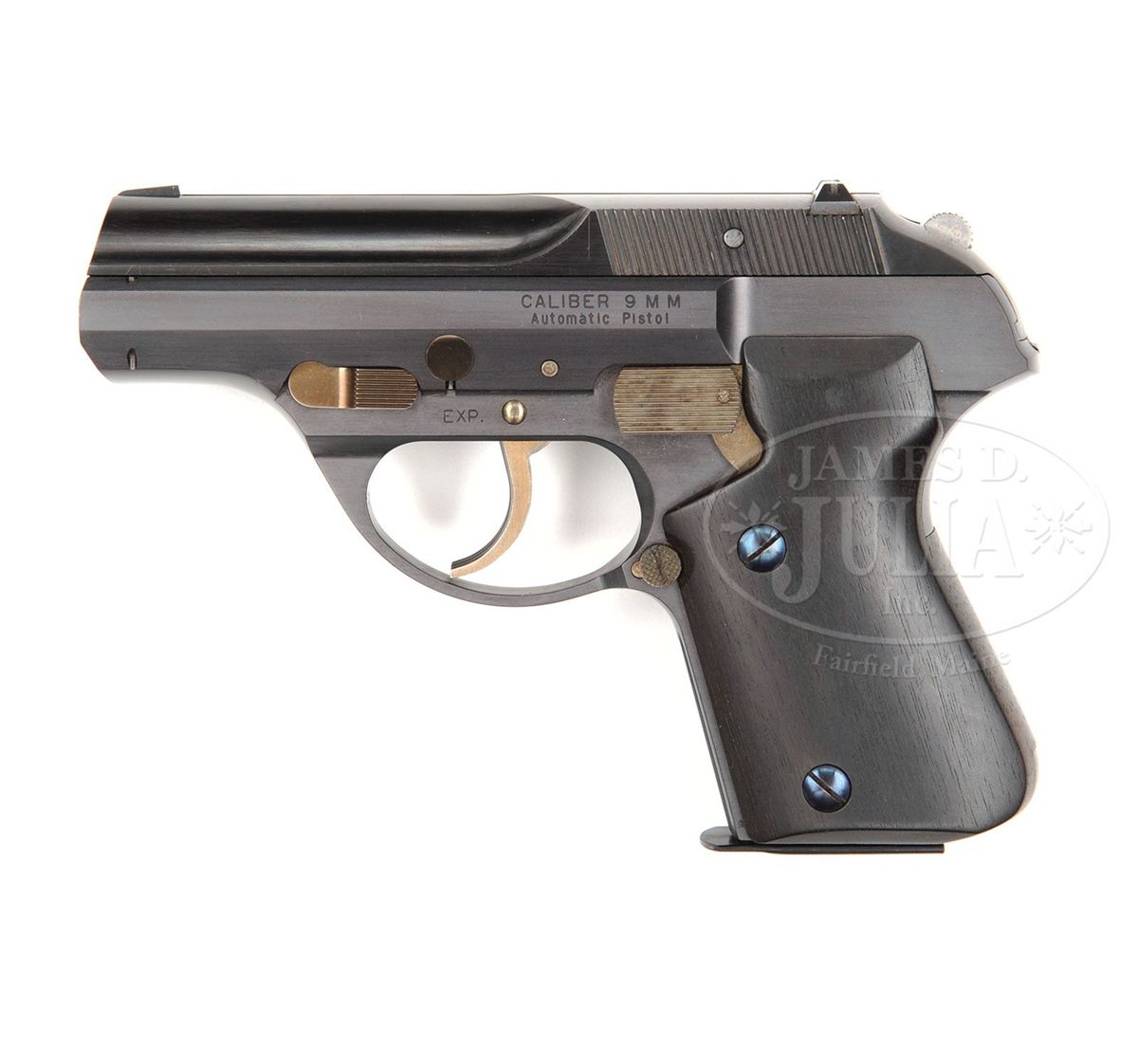 SN EXP. Cal. 9mm Parabellum. Unusual & extremely well built double action pistol, hand made by "Hutch", skilled machinist responsible for building the Joseph D. Kramer Collection miniatures. with 2-3/4" bbl, fixed sights & 2-pc ebony grips. Left side of the frame is marked "CALIBER 9 MM / AUTOMATIC PISTOL". Lower left side of the frame, just above the trigger is marked "EXP.". Trigger, hammer & other external moveable parts are all straw colored. Grip screws are fire blued. Pistol is overall 6-1/4" long by 4-1/2" high and 1-1/2" thick on the frame and weighs 1 lb, 9 oz. A tremendous compact pistol. Accompanied by 1 spare magazine. PROVENANCE: Joseph J. Schroeder, Jr. Collection. CONDITION: New and unfired. Retains virtually all of its orig factory finish. Grips and magazines are also as new. 4-48584 JR91