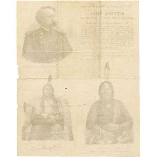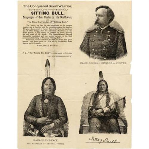 <B>BROADSIDE SIOUX WARRIOR “SITTING BULL” & GEN'L “G. A. CUSTER” 1880</B></I> - This great book<B> </B></I>advertising broadside, with beautiful true to life vignettes depicting “Major-General George A. Custer”, “Rain-In-The- Face”, & “Sitting Bull”. “The conquered Sioux Warrior, Sitting Bull. Campaigns of Gen. Custer in the Northwest, and the final surrender of Sitting Bull”. 9.25”x 12”. Very fine condition, with small tears, and small chips <BR><BR><b>Shipping:</b> Flat Material, Large (<a target="_blank" href="http://www.heritageauctions.com/common/shipping.php">view shipping information</a>)