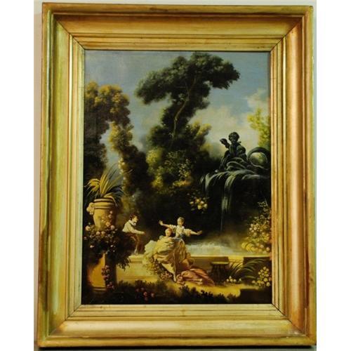 DESCRIPTION: PROGRESS OF LOVE: THE PURSUIT. The painting is a re-interpretation of "The Progress of love: the pursuit? by the renowned French artist Jean Fragonard. As he was a representative of rococo, an artistic style evolved from the early eighteenth century, evolving from the late Baroque (the term "rococo" has a disparaging connotation: rococo derives from the French word used to describe the stones and rocks used in the gardens as embellishment), his works are distinguished by the great elegance, magnificence and ostentation, characterized by wavy branches, undulating curls and floral arabesques. His paintings are characterized by a particular use of light and a rarefaction of shares used as expedient to make light of some parts such as drapery and white hair female. The painting suggested, is part of a "cycle" that goes from the birth of a love to his crown and includes:
