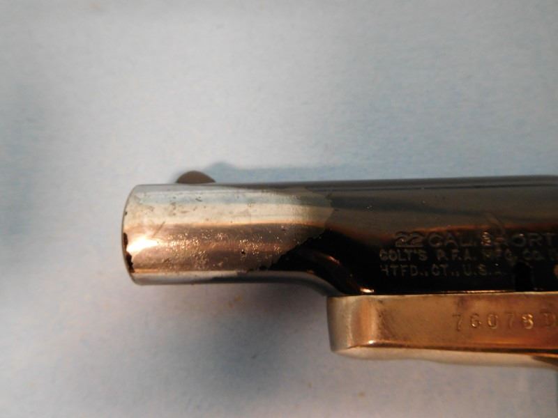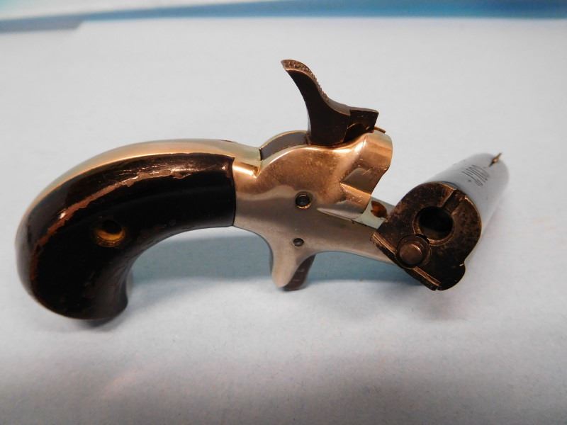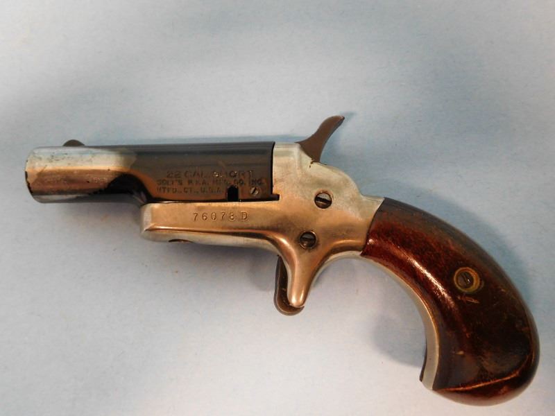 PROHIB: Colt; Derringer #4; .22 Short; Single Shot; Exposed Hammer; 60mm Barrel; 2 SCREWS MISSING FROM BOTTOM & FINISH WORE OFF ON ONE SIDE AT FRONT OF BARREL; Ser # 76078D