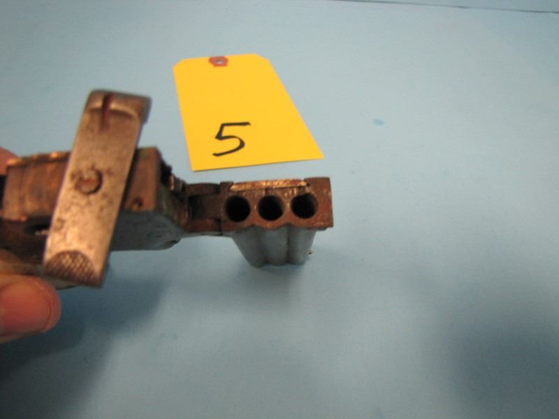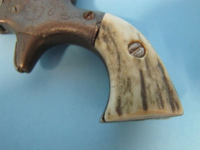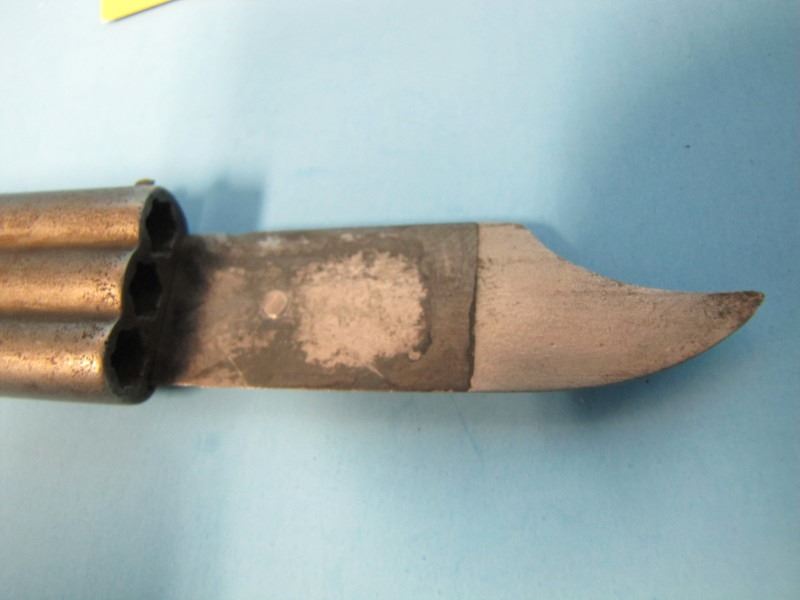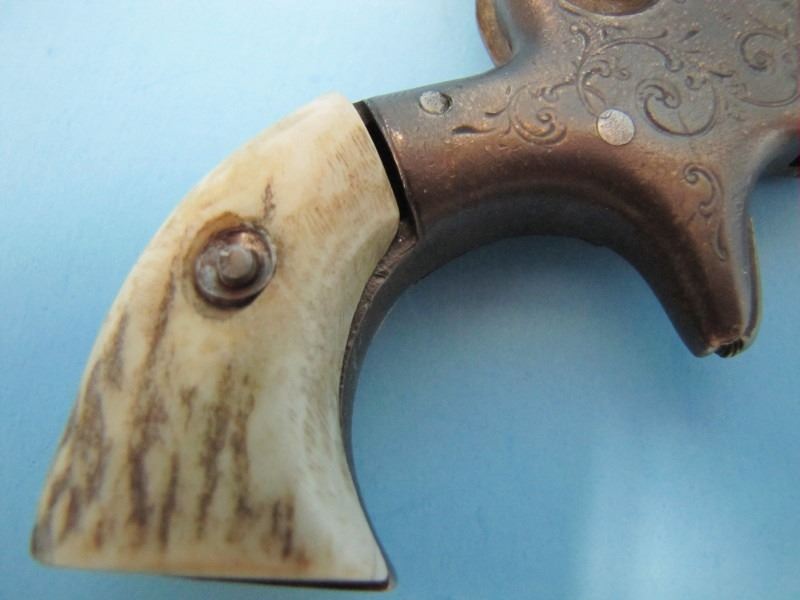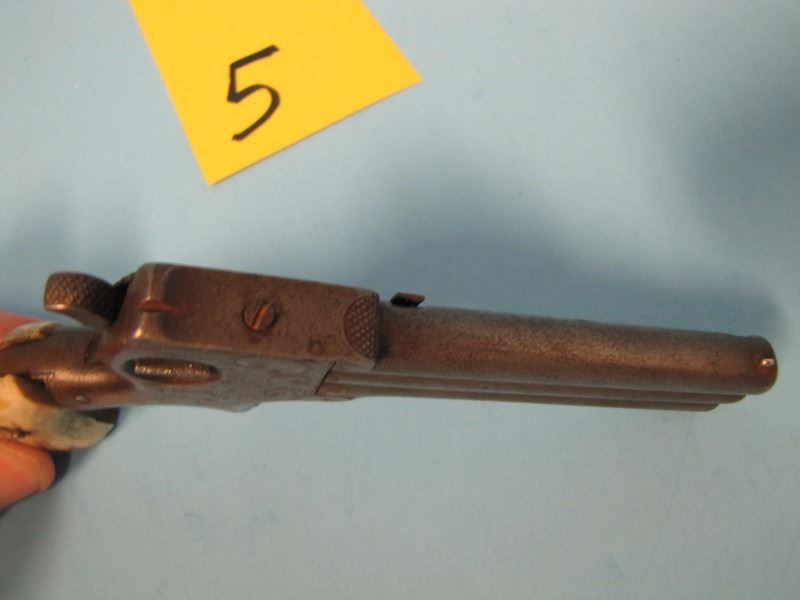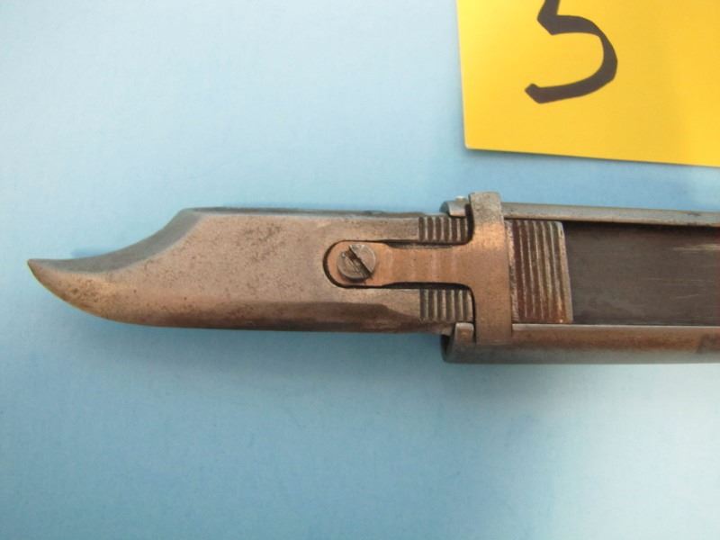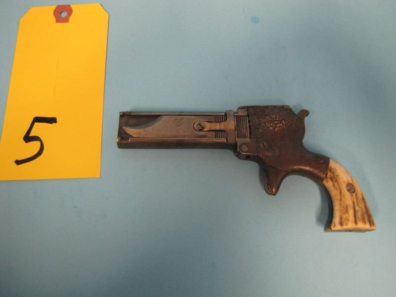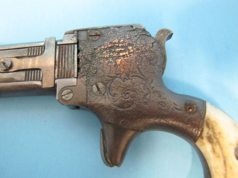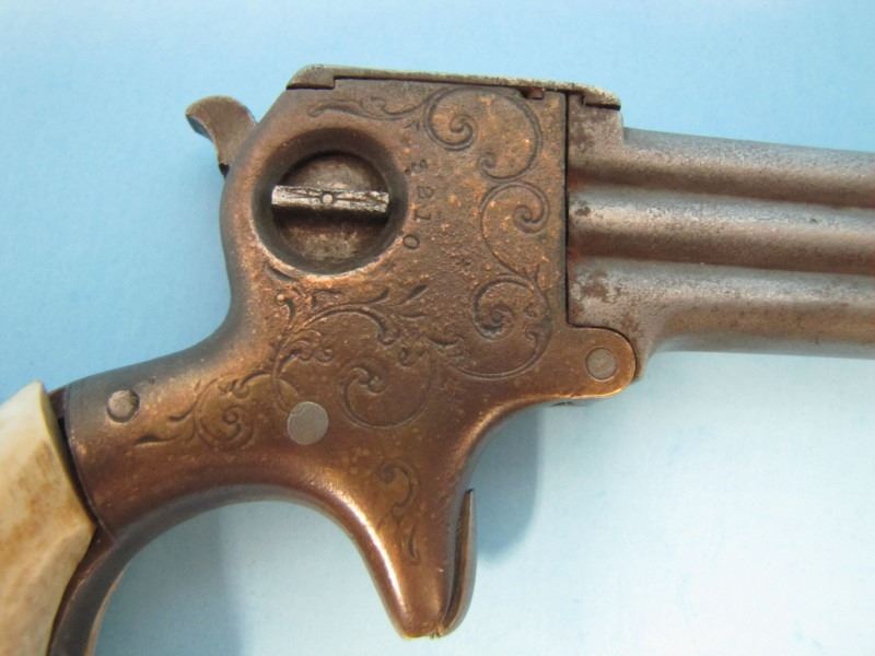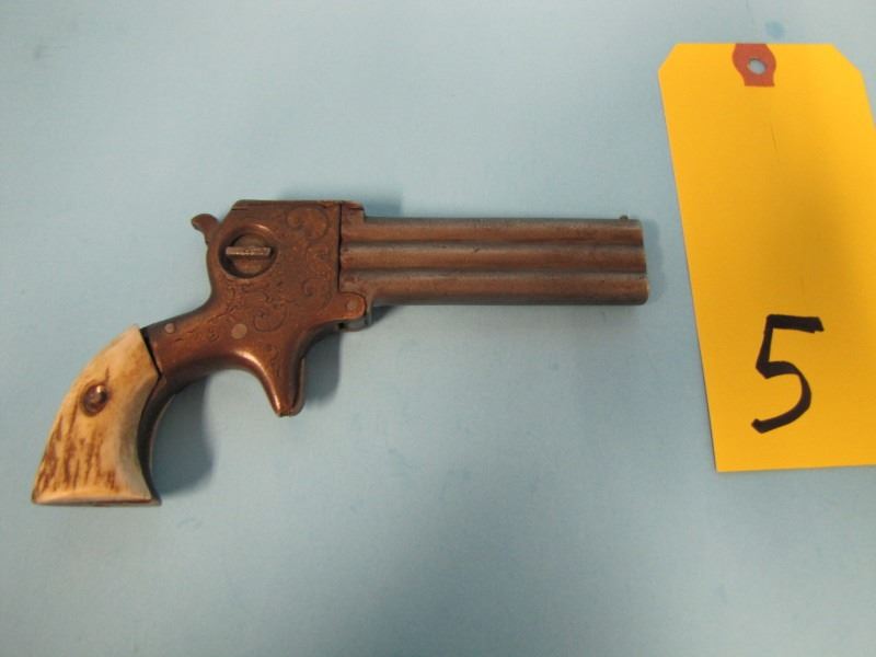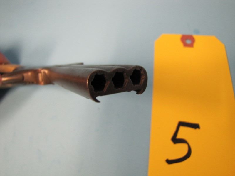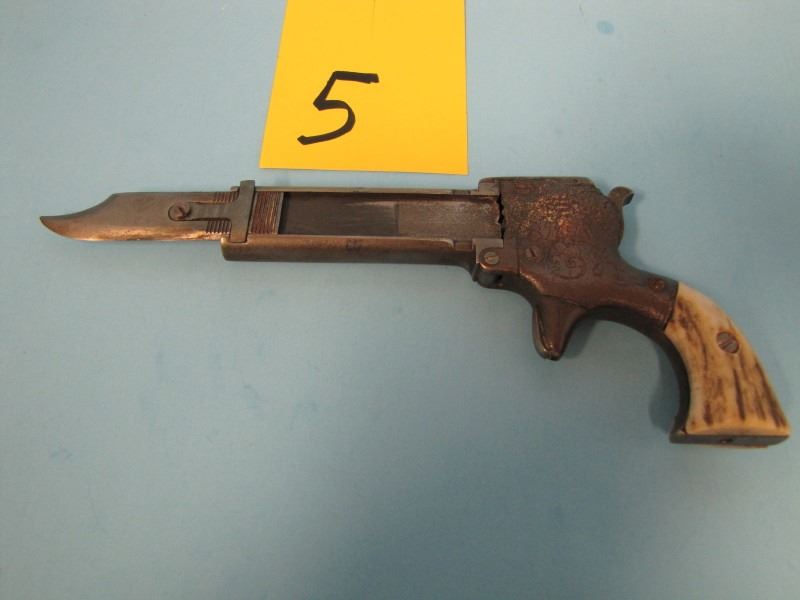 PROHIBITED: Wm. W. Marston STYLE Three-Barrel .22 Derringer with Retractable Knife Blade, engraved brass frame, 3” superposed barrels, Spur Trigger. THE LEFT HAND SIDE OF THE GUN IS BADLY PITTED SO WE ARE UNABLE TO VERIFY THE MAKER OF THE GUN. approximately 1500 made between 1858 & 1864. DOES NOT HOLD COCK. MAIN SPRING MISSING.