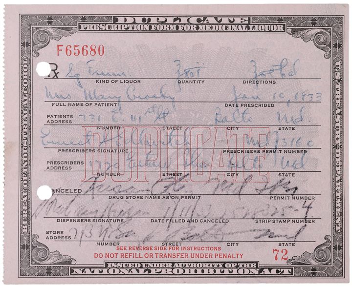 “Prescription Form for Medicinal Liquor Issued Under Authority Of The National Prohibition Act”