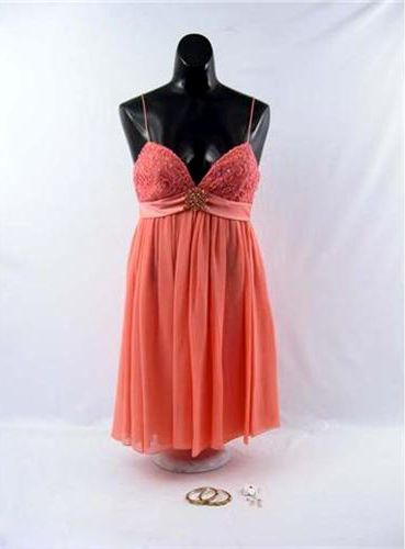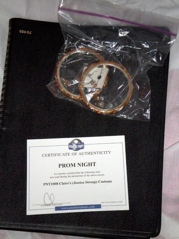 From Prom Night - A Night To Die For. From the set of the spine tingling film, this is Claire's (Jessica Stroup) coral with beaded bra top and coral pin center front "Marc Bouwer" babydoll dress, gold with white and amber stones bangle bracelet and light brown long hanging branch earrings.