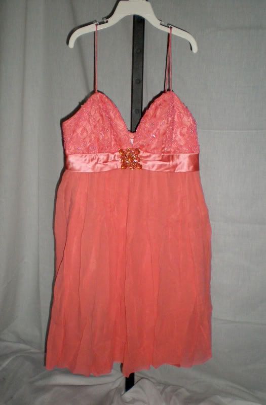 Prom Night - A Night To Die For. From the set of the spine tingling film, this is Claire's (Jessica Stroup) coral with beaded bra top and coral pin center front "Marc Bouwer" babydoll dress, gold with white and amber stones bangle bracelet and light brown long hanging branch earrings. Don't miss this opportunity to own this exclusive costume! Add it to your movie memorabilia collection today!
