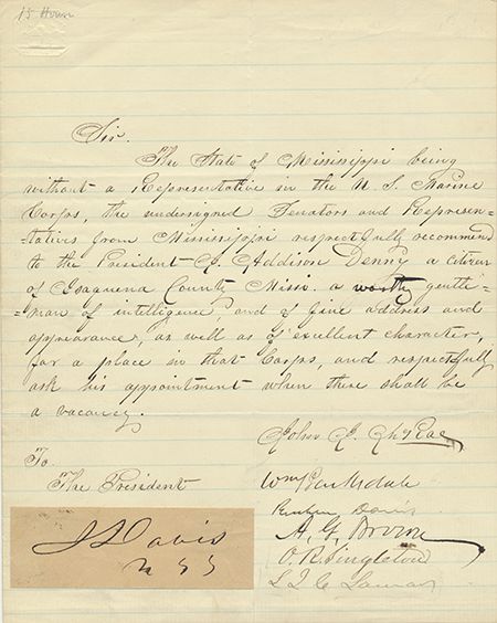 A fine association of important Civil War Mississippians on a single document, 1p. 4to., [n.p., n.d., likely Mississippi, ca, 1860], to "The President", undoubtedly James Buchanan. In part: "...The State of Mississippi being without a Representative in the U.S Marine Corps, the undersigned Senators and Representatives from Mississippi respectfully recommend to the President G. Addison Denny...a worthy gentleman of intelligence, and of fine address and appearance...for a place in that corps...". Signed at conclusion by WILLIAM BARKSDALE, CSA brigadier general killed at Gettysburg, LUCIUS Q. C. LAMAR, Supreme Court Justice and CSA envoy to Russia, REUBEN DAVIS, CSA brigadier general, ALBERT G. BROWN, governor, OTHO SINGLETON, Confederate congressman, and JOHN MCRAE, governor and Confederate congressman. Also attached is a cut signature of JEFFERSON DAVIS which was apparently attached to the petition at the time of its signing as Davis was unavailable in person. One short very clean fold split, else fine.