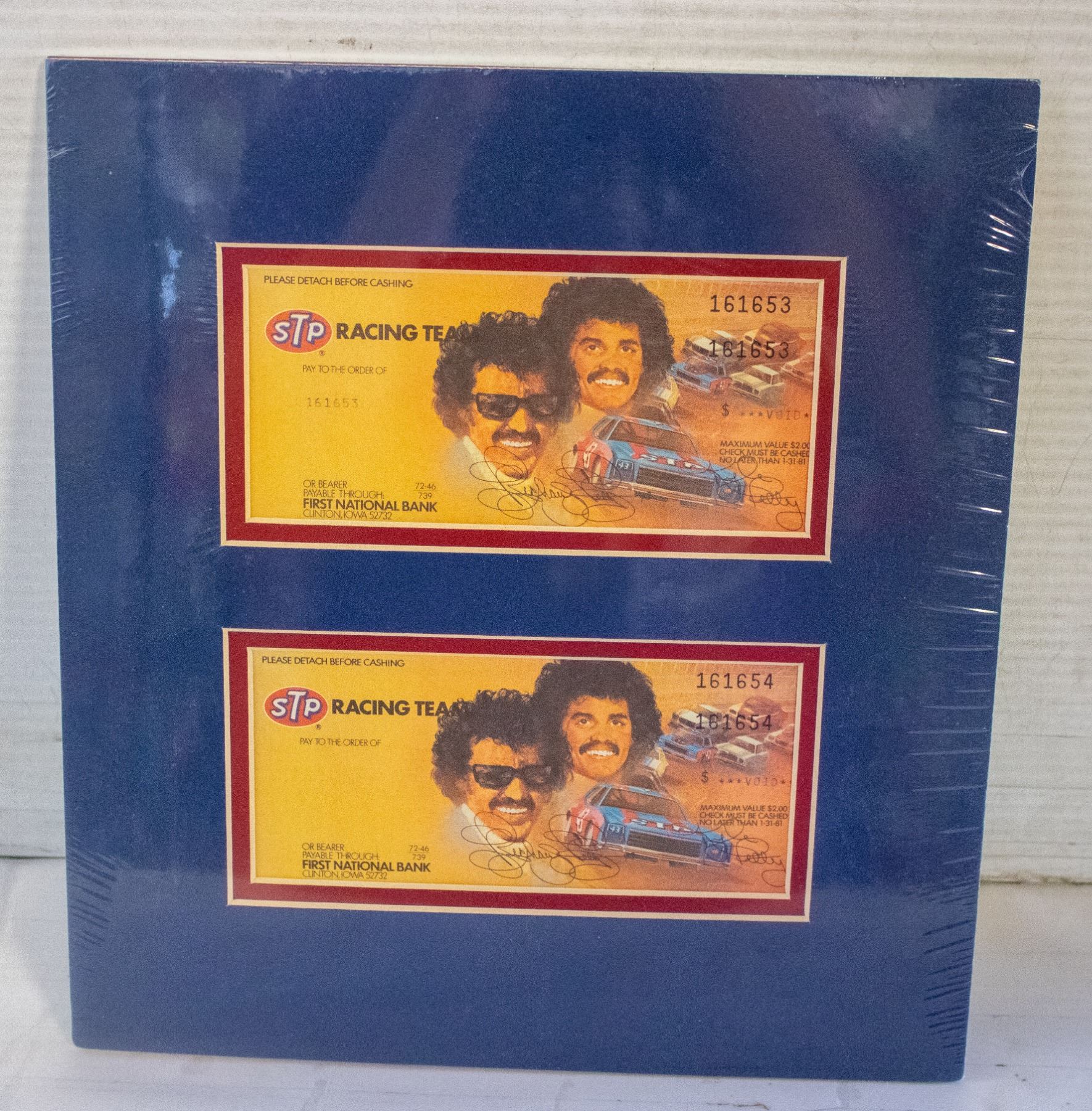 2 CONSECUTIVE NUMBERED EXPIRED CHEQUES DOUBLE MATTED AND SEALED IN SHRINKWRAP - NASCAR