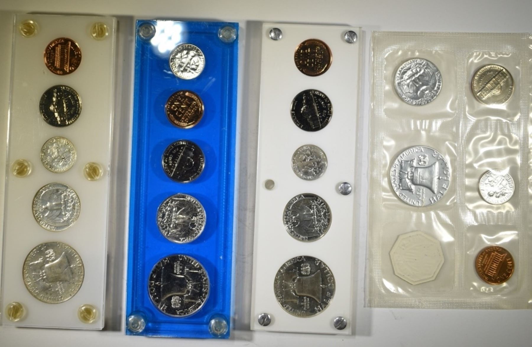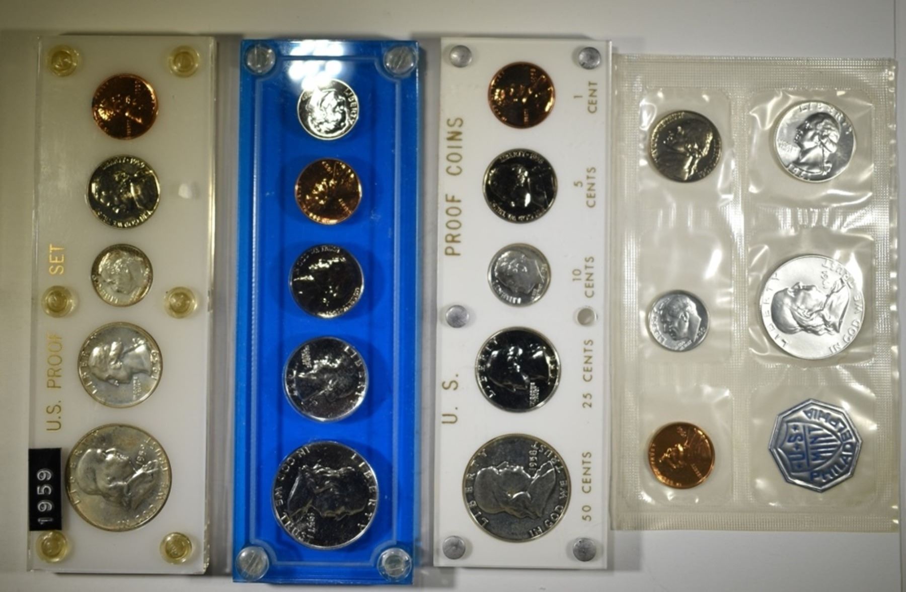 1957, 58 & 59 PROOF SETS IN PLASTIC HOLDERS &  1961  MINT SET.   ESTIMATE $125 - $150. Location 0