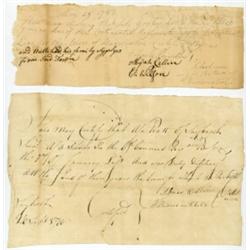 (PROOF OF SERVICE): A lot of two manuscript D.S.'s, the first being 1p. oblong, 8vo., dated Saybrook [Conn.], Sept. 28, 1790 certifying that "...Asa Pratt of Saybrook Servd. as a Soldier in the 6th. Connut. Regt. Before the 1st. of January Last and was Duly Discharged att the End of three years the term for which he Enllisted..." Usual folds, otherwise very good. The second, a D.S. 1p. oblong 12mo., Harwinton, Conn., May 29, 1783 certifies that Seth Gridley saw three years of service in "...one of the Continental Regiments in the Connecticut Line for the town of Harwinton" $75-100
