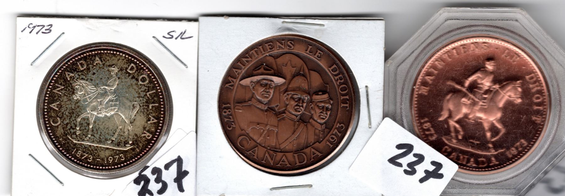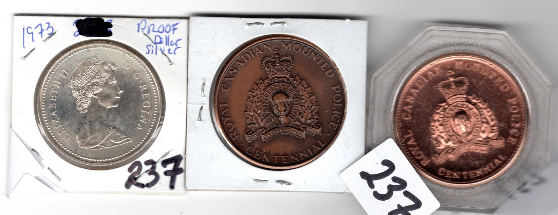 PROOF RCMP NICELY TONED SILVER DOLLAR AND TWO COMMEMORATIVE RCMP TOKEN COINS