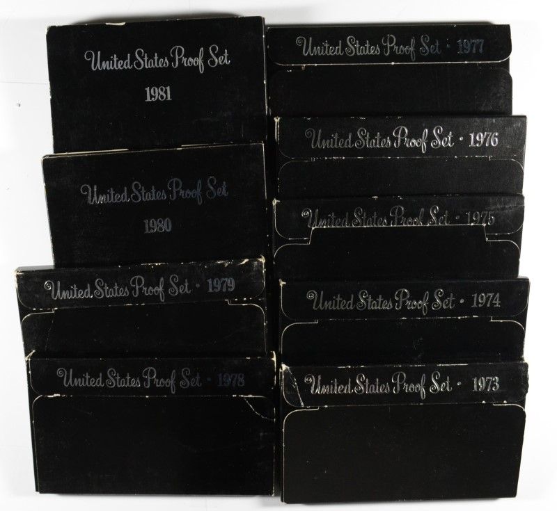 EST $85- $100, 9-SETS TOTAL IN ORIGINAL BOXES Silvertowne is rated as a top auction company because of its expert and accurate grading of coins and currency