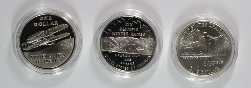 PROOF SILVER DOLLAR BOX/COA: 1990 EISENHOWER, 2003 FIRST FLIGHT, 2002 OLYMPIC