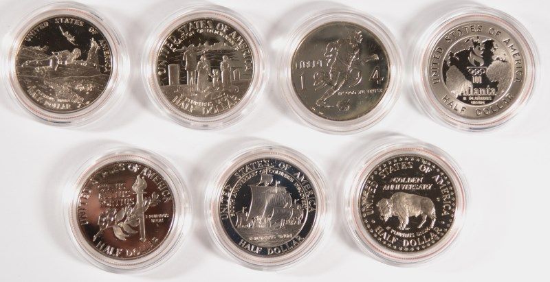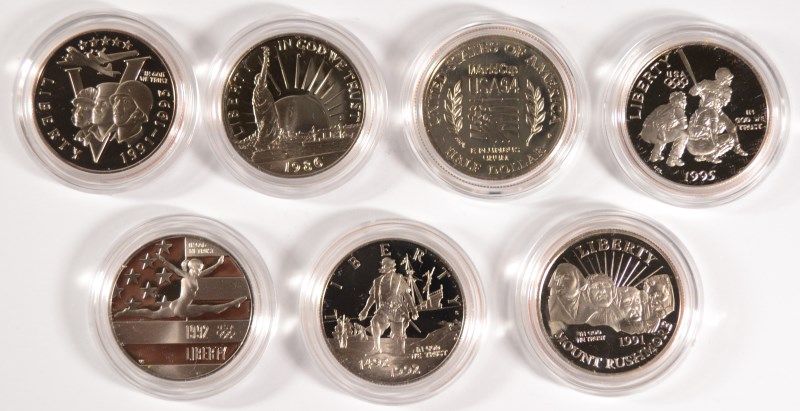1986 STATUE OF LIBERTY, M1994 WORLD CUP, 1995 WWII, 1991 MOUNT RUSHMORE, 1992 COLUMBUS, 1992 OLYMPICS, 1995 BASEBALL, ALL ARE IN CAPSULES, ESTIMATE, $125.00 TO $140.00