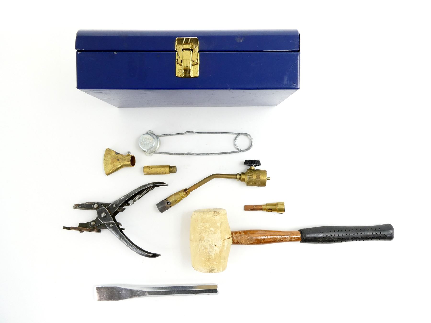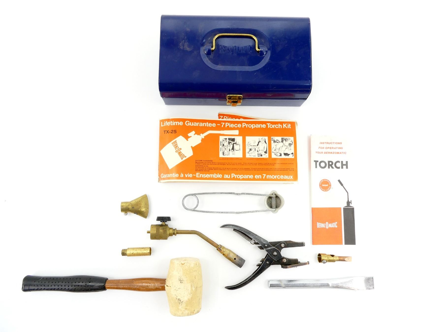 LOT INCLUDES; (1) PROPANE TORCH KIT WITH NOZZLE, THREE SPARE TIPS, SPARKER, CHISEL, CASE, KIT MAY NOT BE COMPLETE & (1) RUBBER MALLET WITH WOOD HANDLE. SEE PHOTOS.