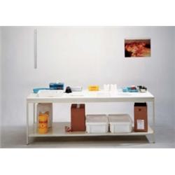 on aluminum, formica table, plastic containers of varying sizes, and assorted medical equipment