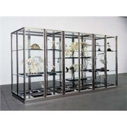 The Hirstian iconography is immediately identifiable: the precision-engineered vitrines, the cabinets of modern curiosities, the regimented displays of surgical instruments, medical devices, whole suspended, dissected, flayed, sectioned, formaldehyde-fixed animals, dotted pharmaceutical paintings and brightly colored canvases covered with butterflies. Each work is accompanied by slick, lengthy titles coined, by Hirst's own admission, with the intent to inform and simultaneously confuse the viewer. In Hirst's own famous words, he explains that "I'm going to die and I want to live forever. I can't escape the fact and I can't let go of the desire" (R. Violette, ed., I WANT TO SPEND THE ReST OF MY LIFE EVERYWHERE, WITH EVERYONE, ONE TO ONE, ALWAYS, FOREVER, NOW, LONDON, 1997, p. 82). Hirst ultimately harnesses in a common framework the scientific and forensic domains to reflect the cyclical patterns of life, decay and death and to chronicle the ingenious agenda of modern science to attenuate, frustrate and, ultimately, escape the burden of disease and to delay terminal decline. Hirst exposes us to the weight of a world of secrets, simultaneously elegant but threatening, the predictable posed to transform at any moment into a random framework and the seeming stability of "order" in a knife-edge balance with chaos. In SOMETHING SOLID BENEATH THE SURFACE OF ALL CREATURES GREAT AND SMALL, Hirst essentially captures the paradigmatic framework for modern science and natural history as a means to explain and codify natural phenomenon and to analyze and interpret data obtained from observation. The vitrine remains a central element in this sculpture, as Hirst exploits this medium with consummate skill to demarcate spaces, to delineate boundaries and to highlight relationships between the animal skeletons to lure the viewer's attention, while simultaneously imposing a subtle physical barrier, which the viewer is not allowed to transcend, thus ultimately rending SOMETHING SOLID BENEATH THE SURFACE OF ALL CREATURES GREAT AND SMALL as a highly provocative and extravagant Hirst masterpiece.