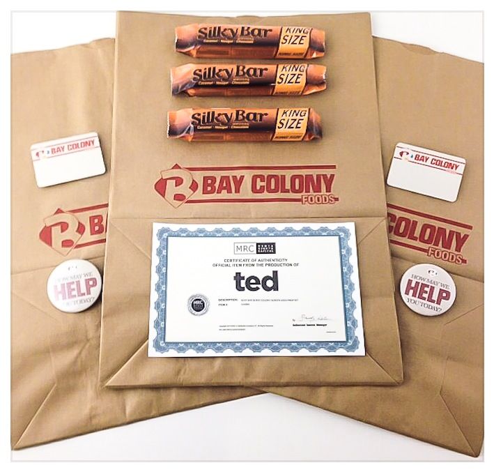 THE ACTUAL USED PROPS FROM 2012 AMERICAN COMEDY FILM TED , DIRECTED BY SETH MACFARLANE INCLUDES 3 SILKY BAR PROPS, 2 BUTTONS, 2 NAME TAGS AND 3 COLONY FOODS PAPER BAGS. INCLUDES A CERTIFUCATE OF AUTHENTICITY FROM THE ORIGINAL PROP COMPANY.