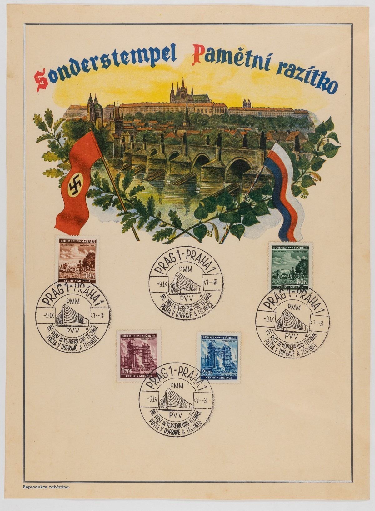 Special stamp sheet for by the Protectorate Bohemia and Moravia with cancels dating the sheet to 1941. The stamps are affixed to a sheet showing the Prague Castle flanked by German flags. 11.5 x 8.5 inches.