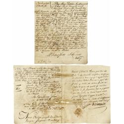 <b>25. (PROTESTING A CAPTURED SHIP) </b>One of the more unusual pieces we have seen, a manuscript D.S., 3pp. 8vo., Boston, Nov. 7, 1781 in which Capt. James McGee "<i>...late Master of the Brig Amsterdam...</i>" swears out a notarized complaint against he British navy for seizing his brig "<i>...ON THE NINETEENTH DAY OF October following being then in Lat 42..46 North was Seized Taken and made Prize of by a British Ship of War named the Amphitrite mounting twenty eight Carriage Guns, Commanded by Robert Biggs who afterwards took out of said Brig the Officers & Crew [words missing] Six of them and ordered them on Board the said Ship and carried them all into Baggaduce in Penobscot River where they arrived the twenty first of October last from whence they Arrived at Boston Yesterday...</i>" On the third page the Consul General of France for New England endorses the notarized protest. Horizontal fold tear results in the loss of a few words, repaired by tape on verso of first page, otherwise very good.<b> $300-500</b>