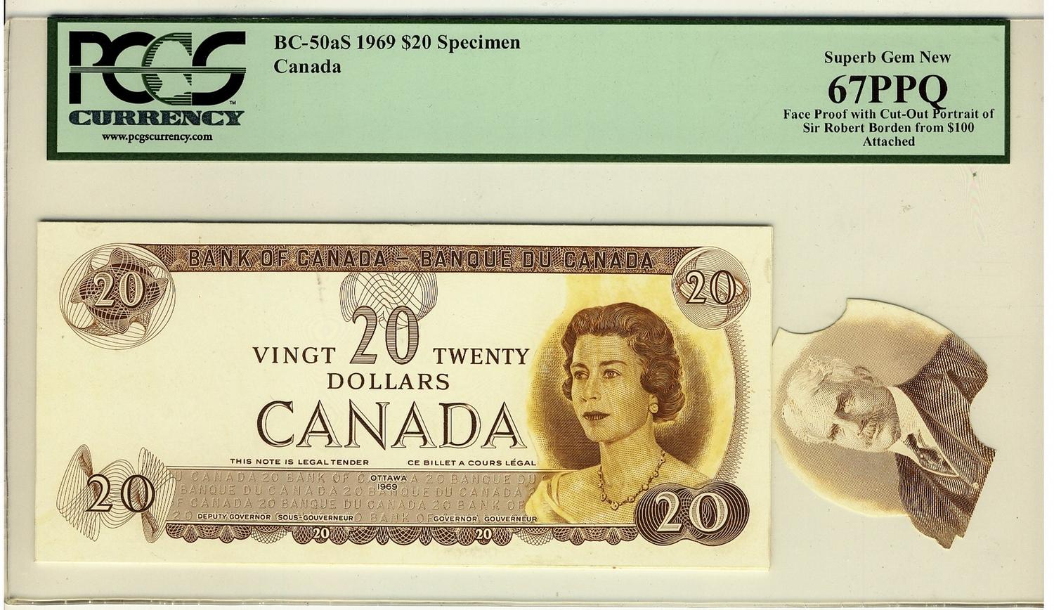 PROTOTYPE 1969 $20 BC-50, PCGS Superb Gem UNC67PPQ. Face proof with cut out portrait of Sir R. Borden from $100 attached, also with the 1975 $100 colours. First one seen by the cataloger and believed to be very rare.