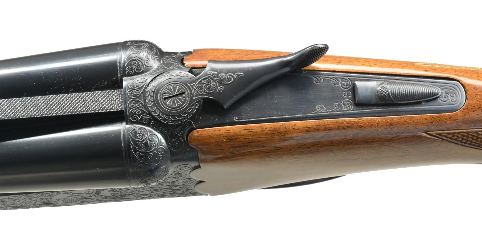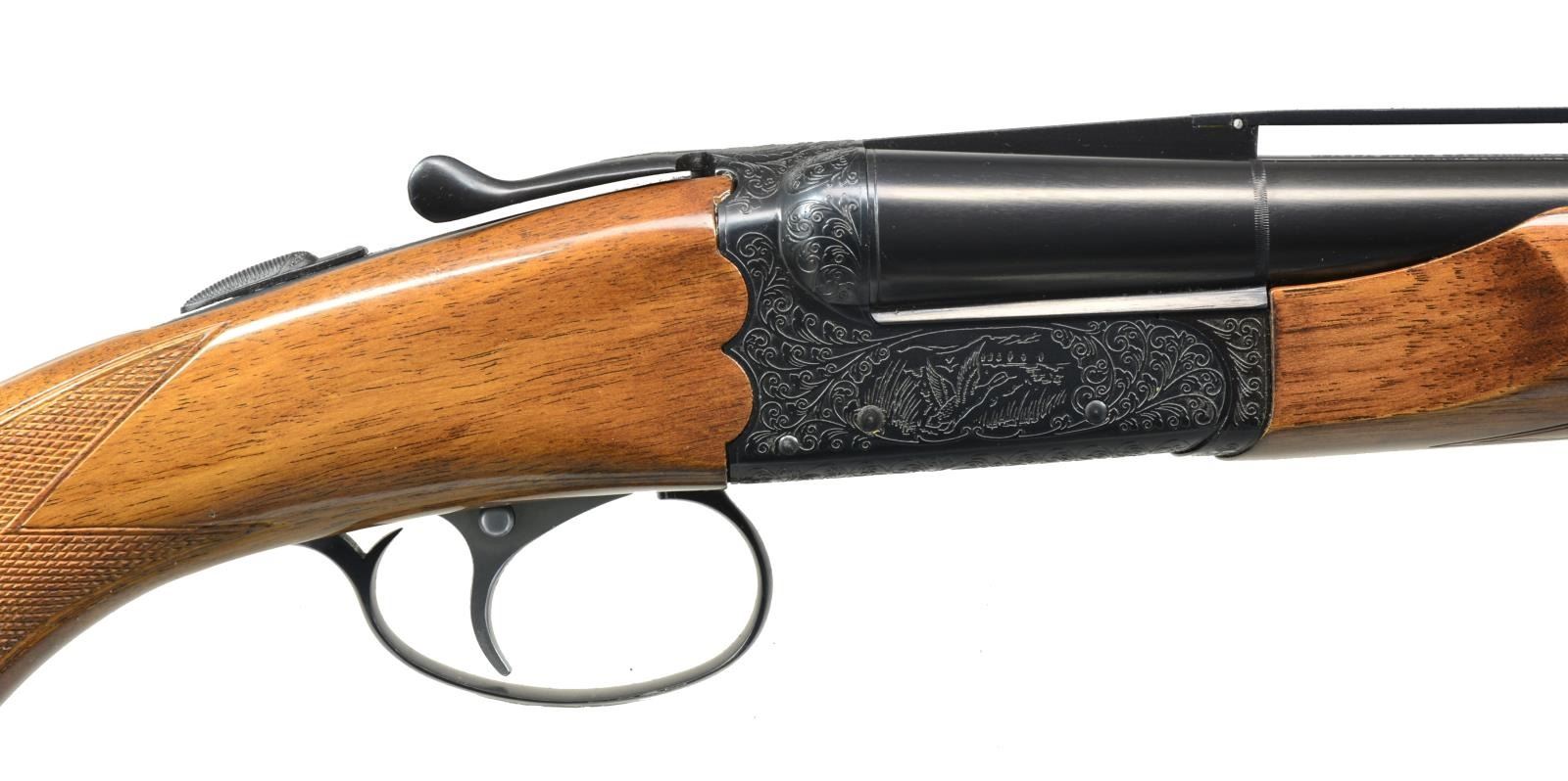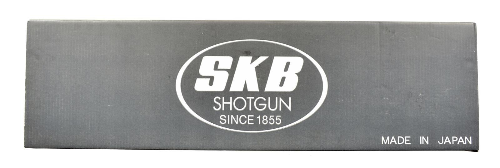 Cal. 28 Ga., 2 3/4". S# 7822. One of only 2 prototypes produced by SKB Arms in the process of developing the 28 Ga. SXS that led to production of the Model 385. This rare gun remained at the factory in Japan until its close when it was imported by SKB USA. Bbls. 28" w/ raised round post VR. Scalloped boxlock action w/ full coverage ornamentation. Ornamentation consist of scenes w/ flying duck on right side, scene w/ flying pheasant on left surrounded by vine type foliate scroll that extends to forearm iron, top lever & trigger guard bow. Satin silver finished push button SST. Extractors. Beavertail forearm & capped pistol grip stock of gloss finished walnut w/ cut checkering. LOP: 13 7/8" over original buttplate. DAC: 1 11/16". DAH: 2 11/16". Stock is cast off for right handed shooter. Weight: 6 lbs., 3 oz. UNATTACHED ACCESSORIES: original box containing trigger lock. CONDITION: as new in box. (20-2416/DS). MODERN. $2,500-3,500.