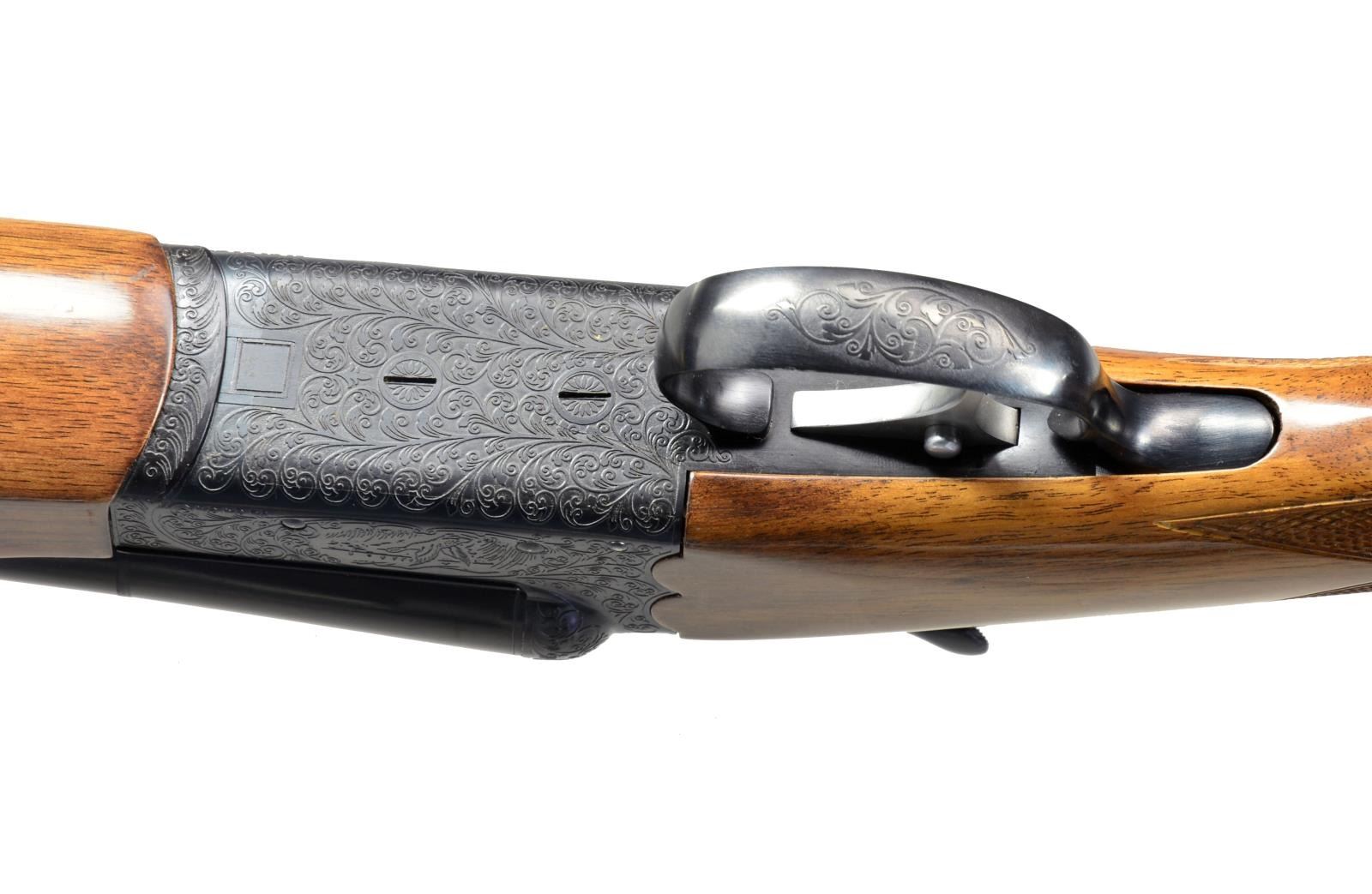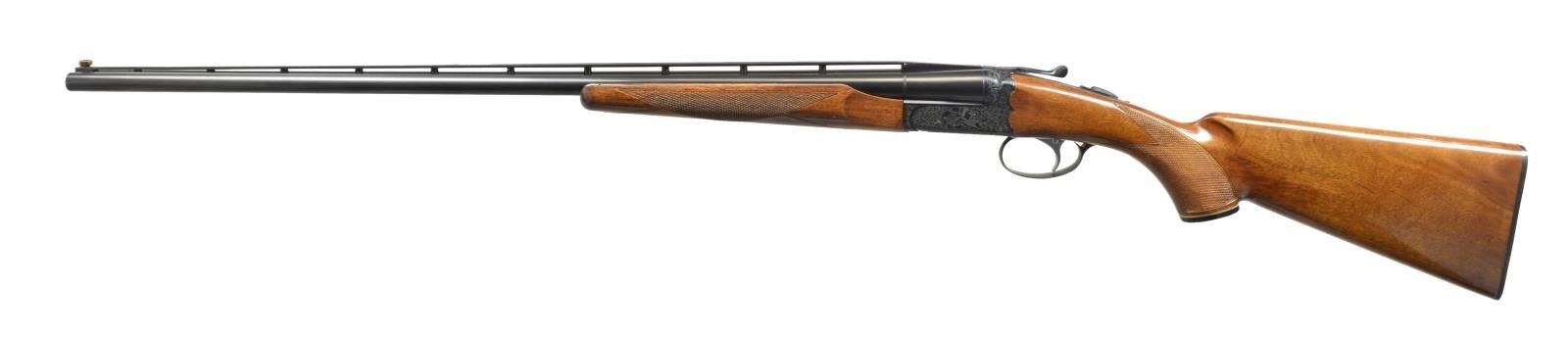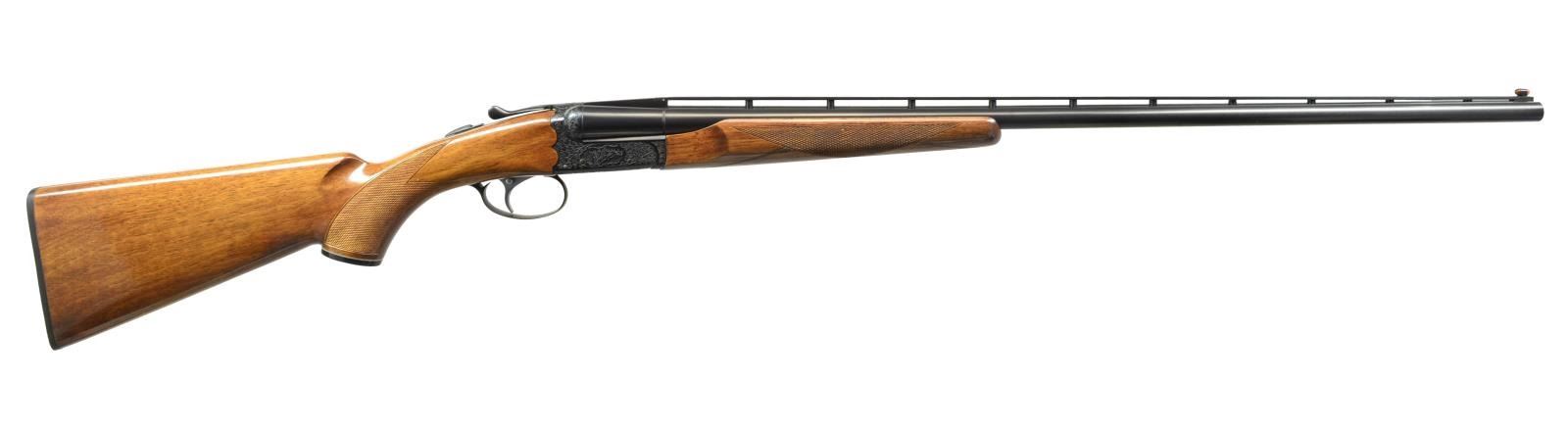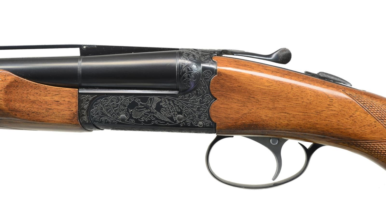Cal. 28 Ga., 2 3/4". S# 7822. One of only 2 prototypes produced by SKB Arms in the process of developing the 28 Ga. SXS that led to production of the Model 385. This rare gun remained at the factory in Japan until its close when it was imported by SKB USA. Bbls. 28" w/ raised round post VR. Scalloped boxlock action w/ full coverage ornamentation. Ornamentation consist of scenes w/ flying duck on right side, scene w/ flying pheasant on left surrounded by vine type foliate scroll that extends to forearm iron, top lever & trigger guard bow. Satin silver finished push button SST. Extractors. Beavertail forearm & capped pistol grip stock of gloss finished walnut w/ cut checkering. LOP: 13 7/8" over original buttplate. DAC: 1 11/16". DAH: 2 11/16". Stock is cast off for right handed shooter. Weight: 6 lbs., 3 oz. UNATTACHED ACCESSORIES: original box containing trigger lock. CONDITION: as new in box. (20-2416/DS). MODERN. $2,500-3,500.