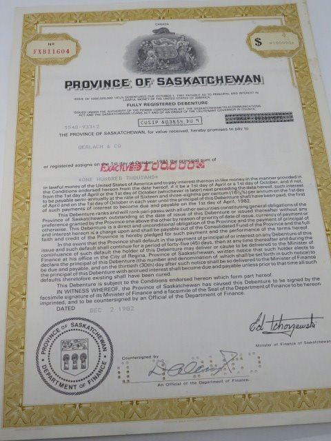 PROVINCE OF SASKATCHEWAN DEBENTURE FOR $100,000 PAID TO GERLACH & CO. 1982