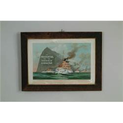 Lot # 574 PRUDENTIAL INSURANCE SIGN. Stone litho illustration of the American "Great White Fleet" steaming past the Straits of Gibraltar on Feb. 6th 1909. A later strip of company advertising has been added along the bottom margin, which says "E.D. Duffield, President", "The Prudential Insurance Company of America", "Home Office Newark, NJ", which strip presumably updates the company information. IMAGE SIZE: 32" w x 22" h. CONDITION: Print itself appears to be in near excellent condition with strong, bright colors. The bottom strip exhibits water staining, which could easily be cropped out. 1-29606 (800-1,200)