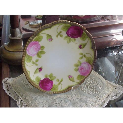 Gorgeous hand painted pink and deep rose color roses and rose buds plate! This is a Prussian plate being a delicate porcelain with lavish use of gold trim. The plate is beautifully hand painted with such lush roses and is signed by the artist. It measures 6 inches across and is in excellent condition. A highly decorative cabinet plate to enjoy adding to your collection. If you enjoy collecting antique lace and linens, barkcloth, all things roses, Shabby Chic, Romantic Cottage and Paris Apartment décor , you may wish to bookmark us since we list often. Thanks and enjoy your day