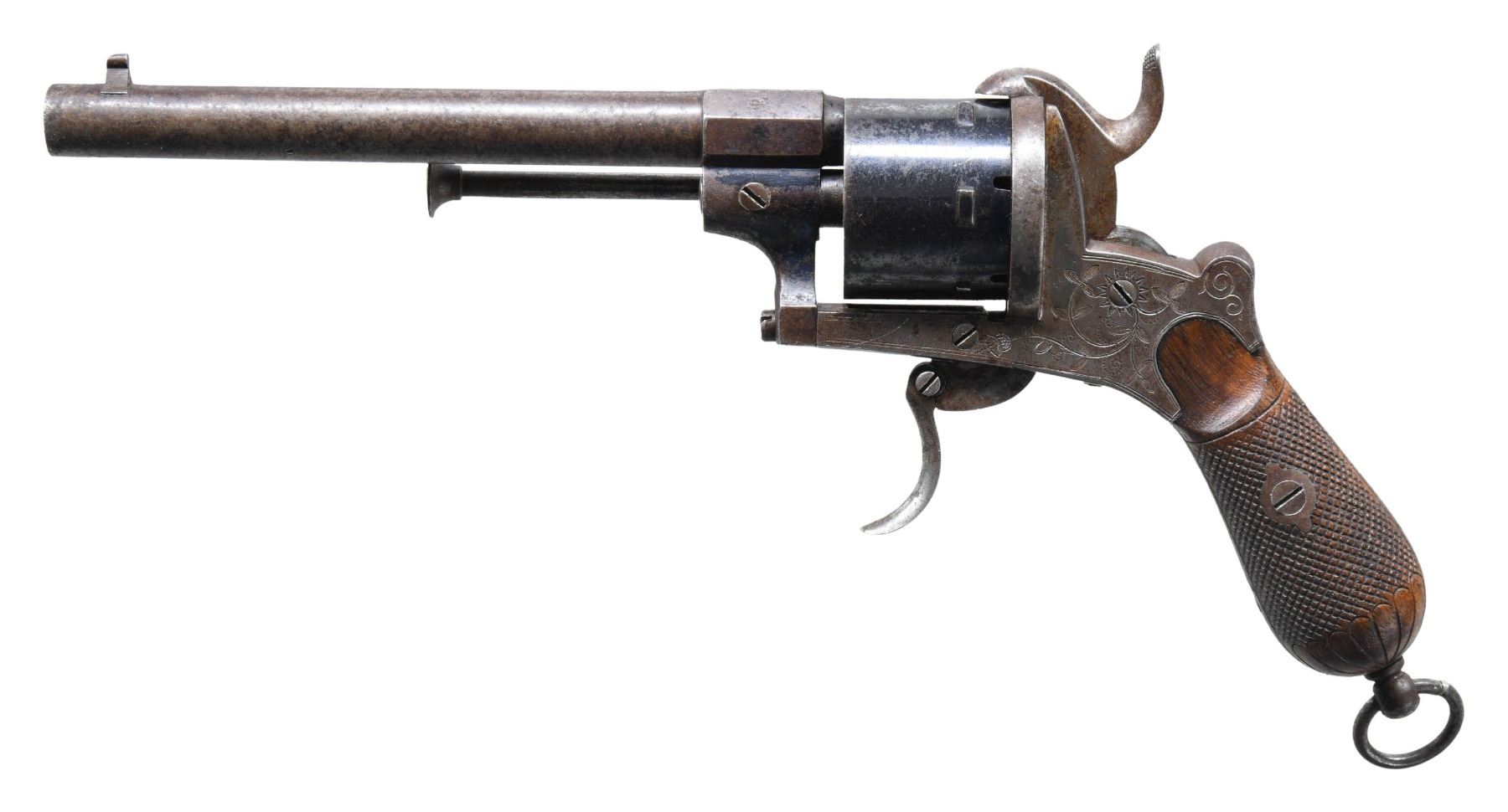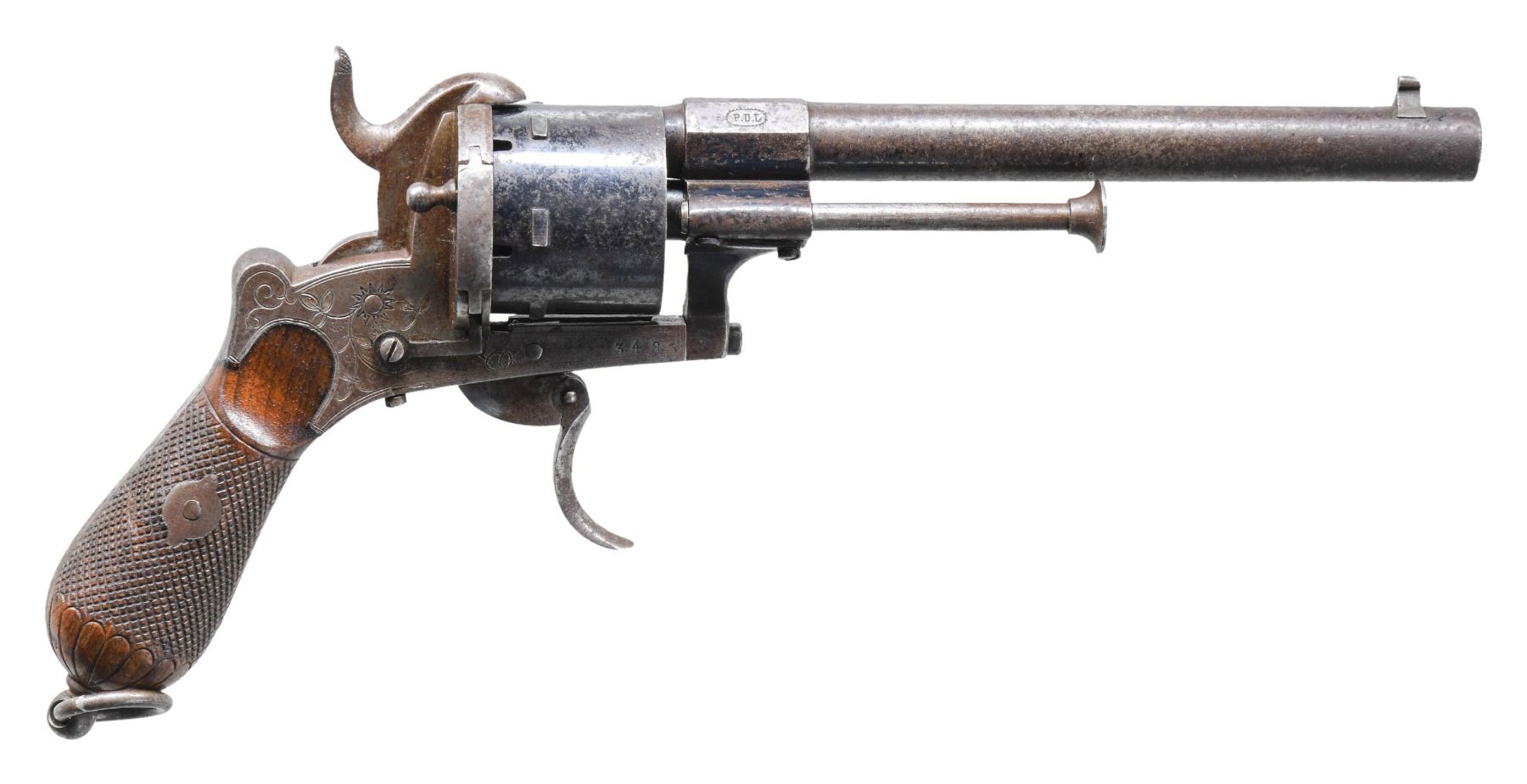 ACTION PINFIRE REVOLVER. Cal. 9mm Pinfire. S# 3485. Bbl. 5 7/8". Folding trigger double action pinfire revolver produced by PD Luneschloss of Solingen, Germany. In 1863, a number of Solingen mfgs. began produced pinfire revolvers as a means to compete with Belgium and France. The top flat of the faceted breech is marked "9 m/ m", with "P.D.L." (PD Luneschloss) marked on the right quarter flat, and a faint Prussian Eagle/SP (also stamped on the cyl) on the left quarter flat. Sides of frame exhibit light foliate engraving, which extends to the back strap. Metal components exhibit a blue finish. Frame is mounted with 2-piece checkered wood grips and features a lanyard swivel and ring on the butt. Dovetailed blade front sight with V-notch rear sight on hammer. Frame, hammer, cyl., and bbl. are matching. CONDITION: frame exhibits a mottled gray patina with scattered spots of age related discoloration and dark surface oxidation. Cyl. exhibits light wear with mild surface oxidation overall. Bbl. retains traces of bluing, with the balance exhibiting a gray/brown patina and varying degrees of oxidation. Bore is bright, exhibiting some scattered spots of dark pitting and a patch of pitting towards the muzzle, while retaining strong rifling throughout. Proper manual mechanics in SA and DA. Grips show light wear and a few handling marks, but otherwise remain sound. PROVENANCE: Estate Collection of Nicholas Apergis. (01-27524/MLW). ANTIQUE. $400-600.
