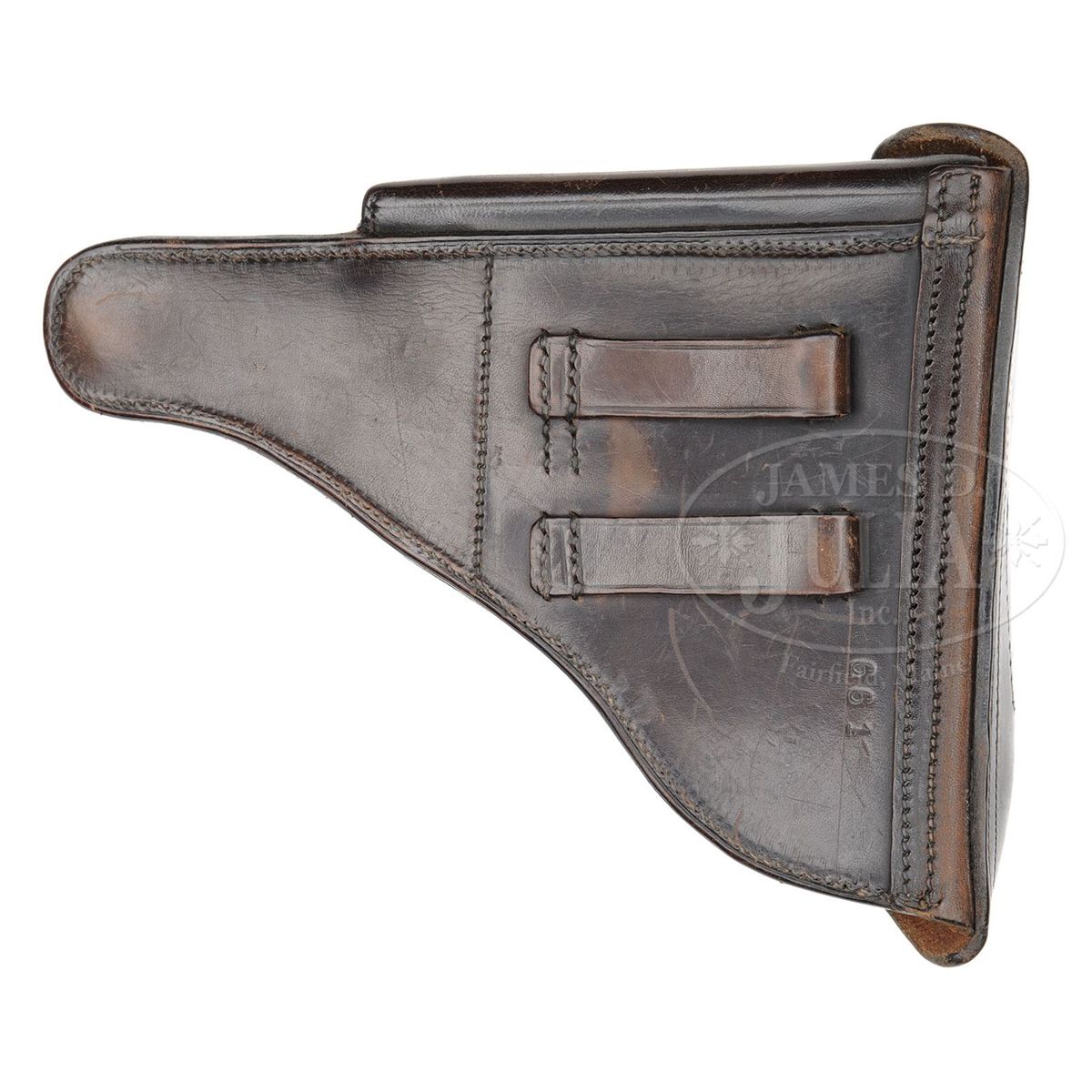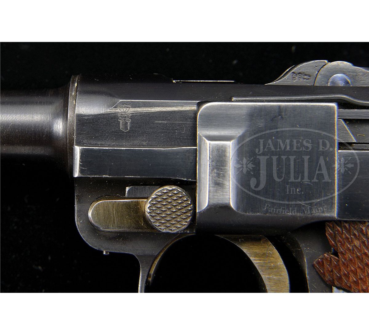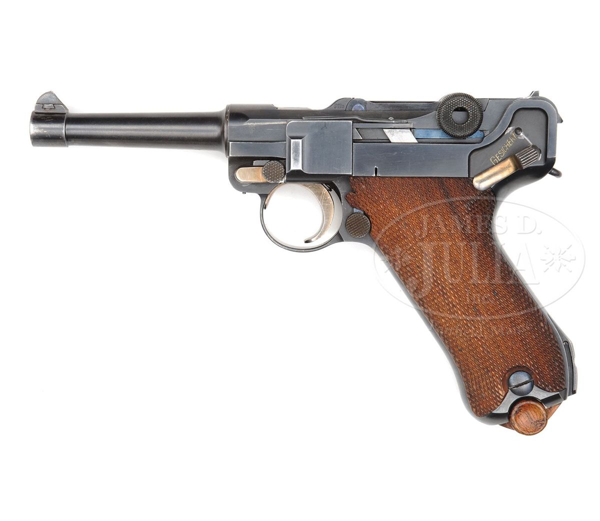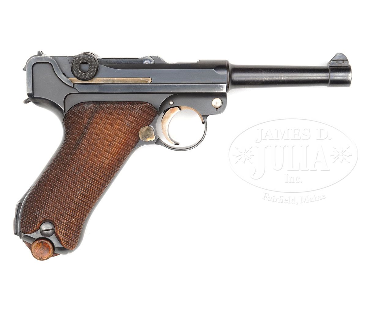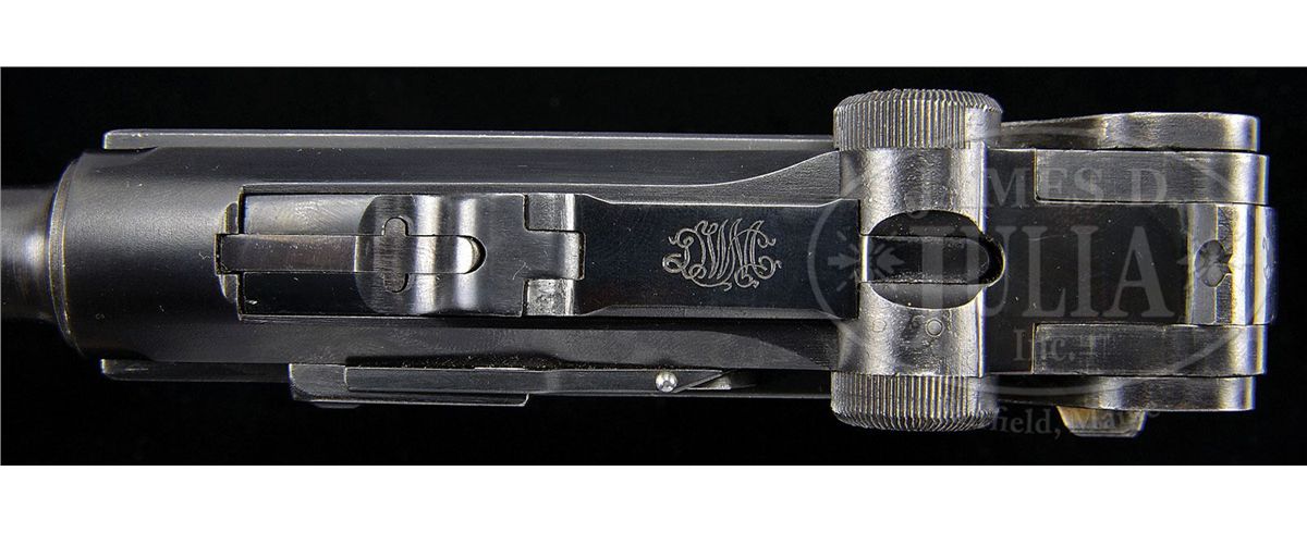 SN 662v. 4" 9mm bbl. DWM scroll on center toggle link. Large, fine line Crown/Crown/U on left side of receiver and bbl. Sear safety. Deactivated Walther magazine safety. Checkered walnut grips. All numbered parts are matching. Original matching numbered wood bottom magazine. Rare V Suffix Luger with parts made by DWM and finished by Mauser. This gun is featured on pp. 538, 611, 750, 768, and 1298 of Dr. Geoffrey Sturgess' The Borchardt & Luger Automatic Pistols. Accompanied by original dark chocolate colored leather Prussian police holster of Akah manufacturing style that is numbered on the back 661, one digit off the gun serial number. PROVENANCE: Collection of Dr. Geoffrey Sturgess. CONDITION: Excellent retaining 97% original early Mauser finish with very high polish toggle assembly and matt frame recess panels. 95% original straw. Bore is sharp with frosting. Grips are sharp with very little wear and nice wood grain. Left grip is missing upper left hand corner from installation of magazine safety. Magazine is very good. Some corrosion on the body. Mechanics are sound. Holster is excellent with original finish with light scuffs. 4-52983 BWS31