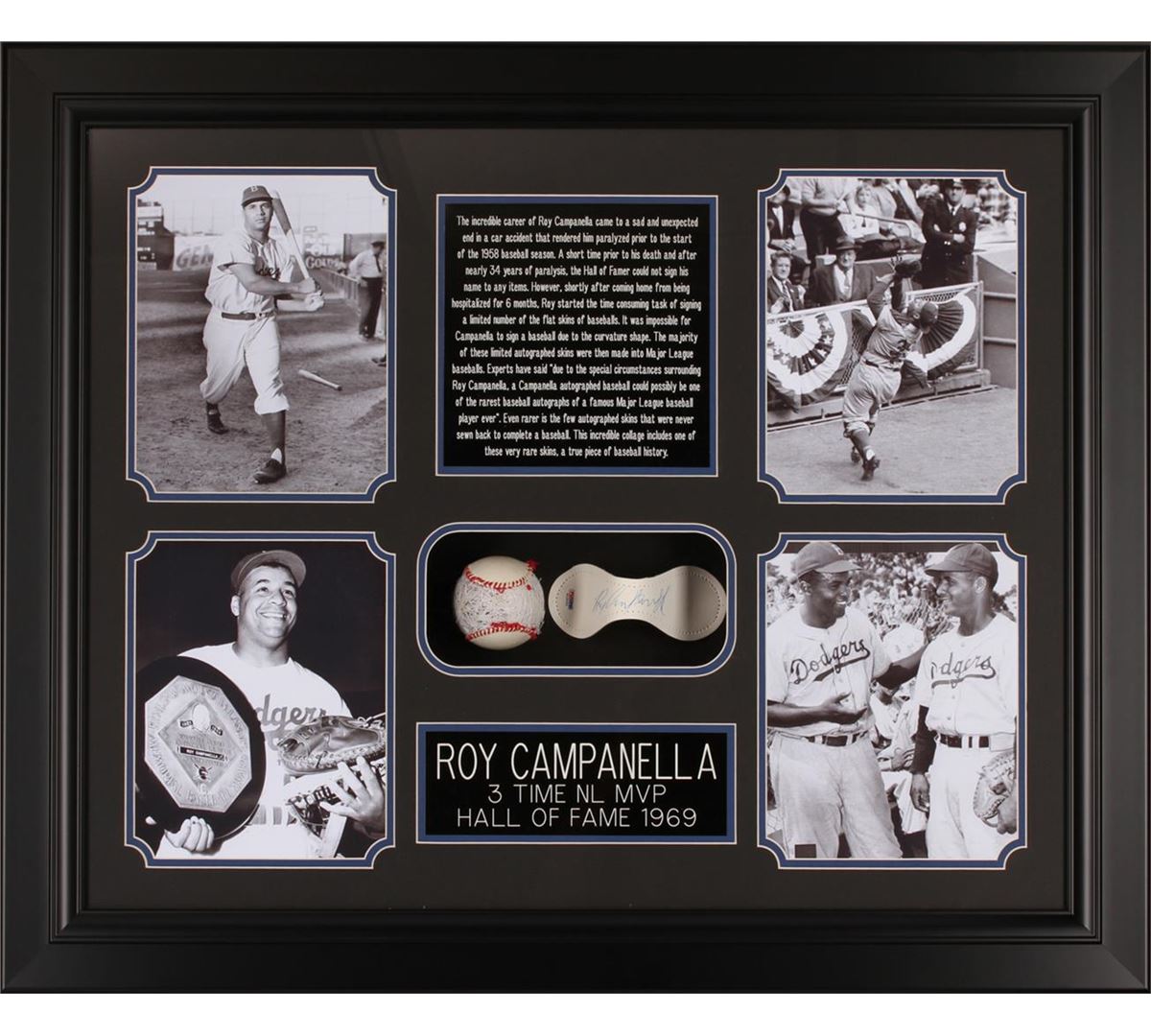 The incredible career of Roy Campanella came to a sad and unexpected end in a car accident that rendered him paralyzed prior to the start of the 1958 baseball season. A short time prior to his death and after nearly 34 years of paralysis, the Hall of Famer could not sign his name to any items. However, shortly after coming home from being hospitalized for 6 months, Roy started the time consuming task of signing a limited number of the flat skins of baseballs. It was impossible for Campanella to sign a baseball due to the curvature shape. The majority of these limited autographed skins were then made into Major League baseballs. Experts have said, "Due to the special circumstances surrounding Roy Campanella, a Campanella autographed baseball could possibly be one of the rarest baseball autographs of a famous Major League Baseball player ever. Even rarer is the few autographed skins that were never sewn back to complete a baseball." This incredible collage includes one of these very rare skins (PSA Certified), a true piece of baseball history. The collage measures 35 x 29 inches. PSA Certified.