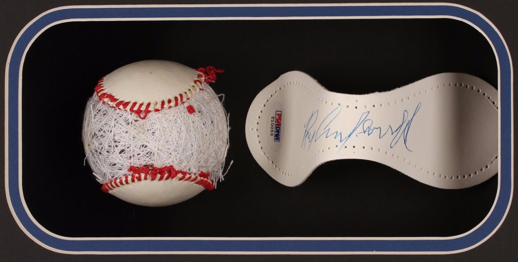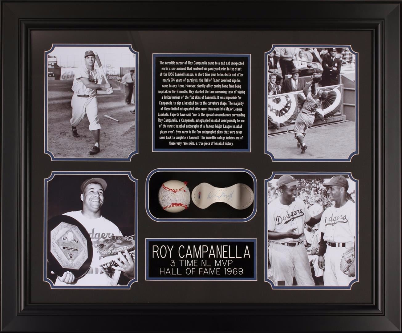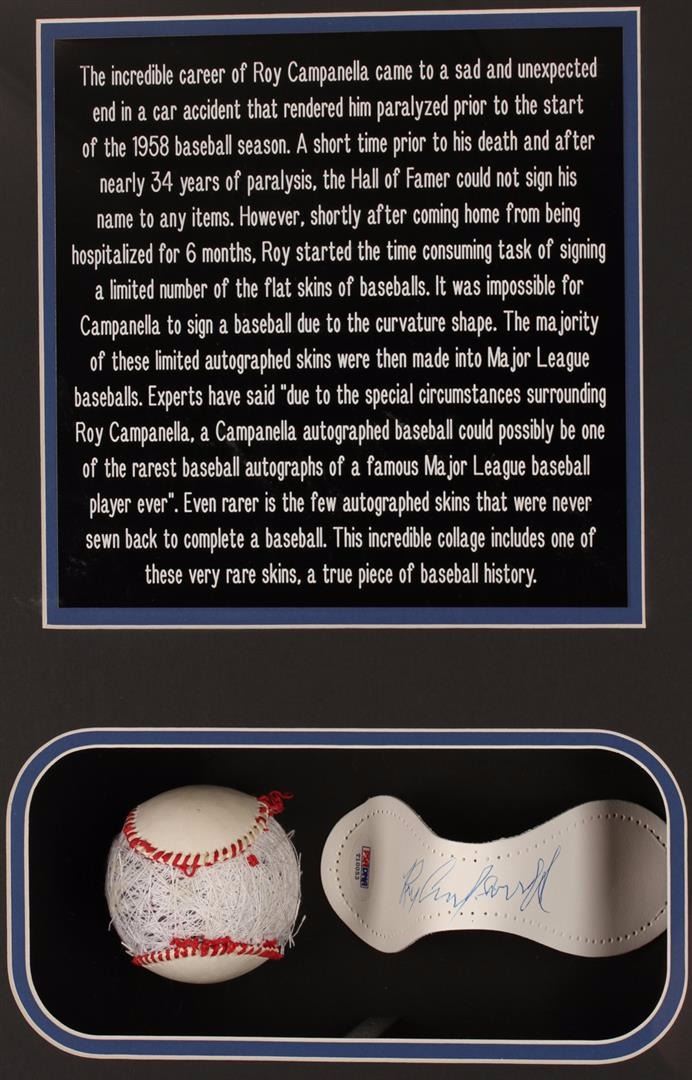 The incredible career of Roy Campanella came to a sad and unexpected end in a car accident that rendered him paralyzed prior to the start of the 1958 baseball season. A short time prior to his death and after nearly 34 years of paralysis, the Hall of Famer could not sign his name to any items. However, shortly after coming home from being hospitalized for 6 months, Roy started the time consuming task of signing a limited number of the flat skins of baseballs. It was impossible for Campanella to sign a baseball due to the curvature shape. The majority of these limited autographed skins were then made into Major League baseballs. Experts have said, "Due to the special circumstances surrounding Roy Campanella, a Campanella autographed baseball could possibly be one of the rarest baseball autographs of a famous Major League Baseball player ever. Even rarer is the few autographed skins that were never sewn back to complete a baseball." This incredible collage includes one of these very rare skins (PSA Certified), a true piece of baseball history. The collage measures 35 x 29 inches. Comes with Certificate of Authenticity. PSA Certified.