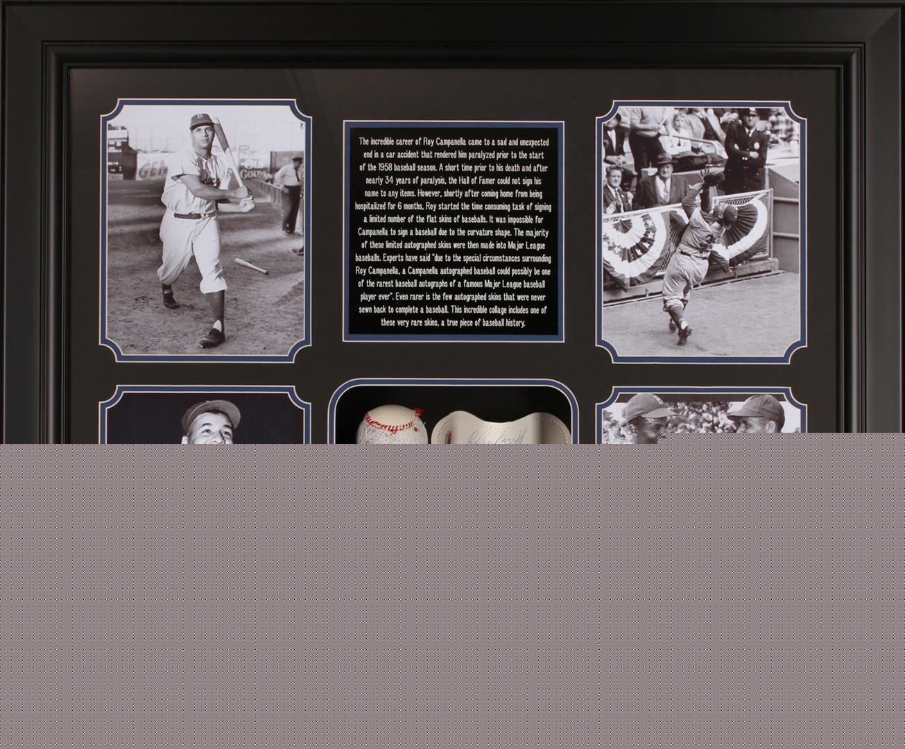 The incredible career of Roy Campanella came to a sad and unexpected end in a car accident that rendered him paralyzed prior to the start of the 1958 baseball season. A short time prior to his death and after nearly 34 years of paralysis, the Hall of Famer could not sign his name to any items. However, shortly after coming home from being hospitalized for 6 months, Roy started the time consuming task of signing a limited number of the flat skins of baseballs. It was impossible for Campanella to sign a baseball due to the curvature shape. The majority of these limited autographed skins were then made into Major League baseballs. Experts have said, "Due to the special circumstances surrounding Roy Campanella, a Campanella autographed baseball could possibly be one of the rarest baseball autographs of a famous Major League Baseball player ever. Even rarer is the few autographed skins that were never sewn back to complete a baseball." This incredible collage includes one of these very rare skins (PSA Certified), a true piece of baseball history. The collage measures 35 x 29 inches. Comes with Certificate of Authenticity. PSA Certified.