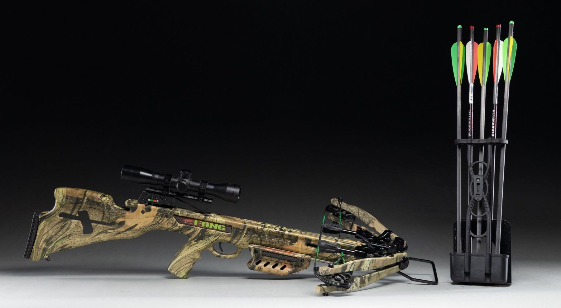 PSE Fang compound crossbow with unmarked scope. Camo finish. UNATTACHED ACCESSORIES: shipping box with manual, small bag of accessories & 5 arrows. CONDITION: very good overall with some paint flaking & operational wear. (02-24636/MJC). NON-GUN. $200-300.