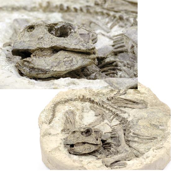PSITTACOSAURUS DINOSAUR IN MATRIX. Psittacosaurus is a very important dinosaur that lived between 120-130 million years ago in Liaoning Province, Central Asia. Psittacosaurus is important as being the oldest ancestor of the famous horned dinosaurs such as Triceratops as well as having some type of quill type feathers on its tail. This is extremely important as before this only theropod (meat eating dinosaurs) were found with feathers. This means that the even earlier ancestor before ornithopods like Psittacosaurus and all theropods split must have had feathers. Only male Psittacosaurs had small horns just below their eyes. All Psittacosaurs had a horned beak and bony Jugals (back of the upper jaw) which are characteristic of only ceroptopsian (horned) dinosaurs. Psittacosaurus was a very small dinosaur being only 4-5 feet long as an adult. This 19-20 inch long juvenile is still entombed in its 14 x 13 inch original matrix in the same position it was buried in when covered under volcanic ash over 120 million years ago, a sort of dinosaurean Pompei.