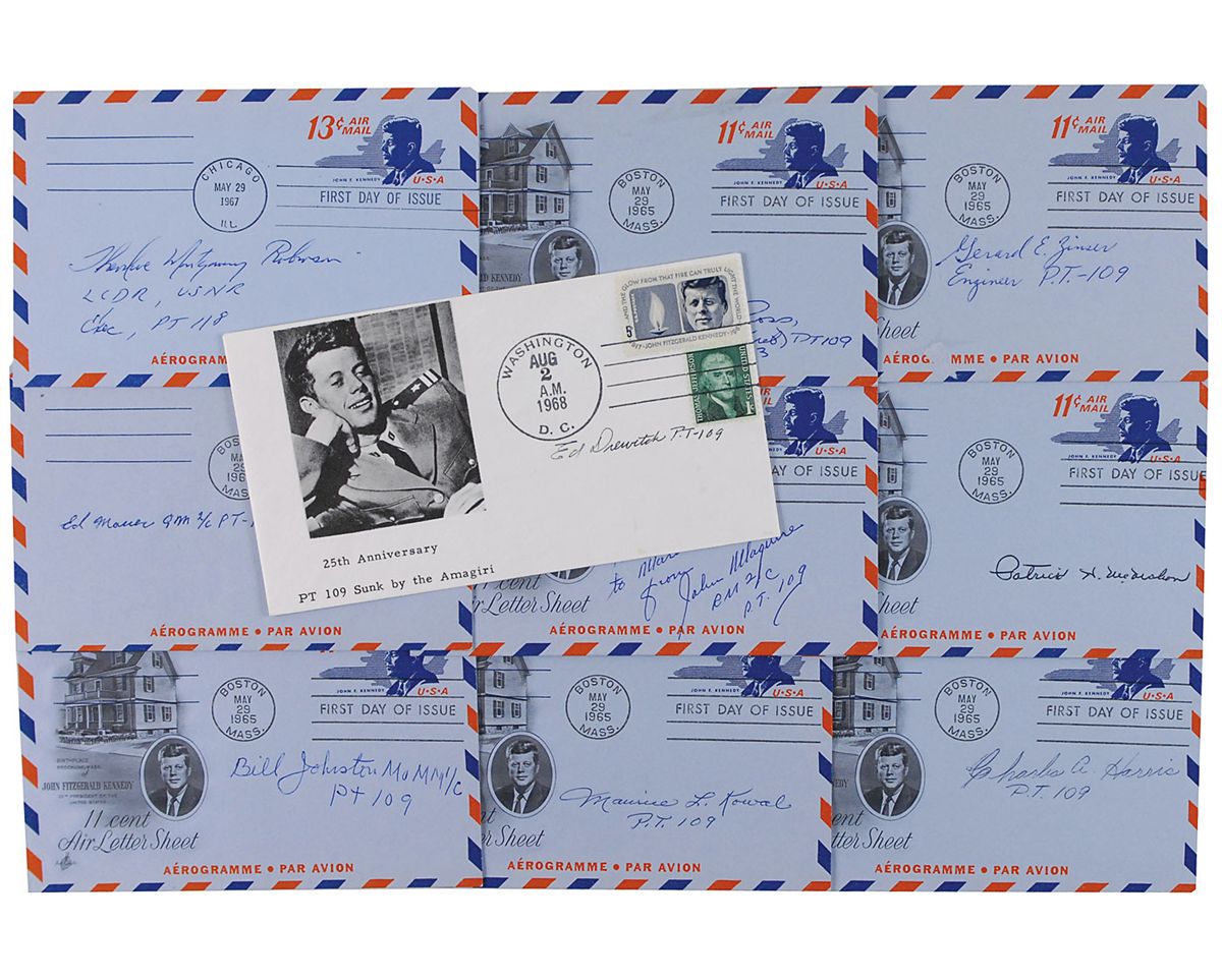 Ten FDCs with cachets honoring John F. Kennedy, each signed in ink or ballpoint by a survivor or crew member of the PT-109. Signers are: Edmund Drewitch, Charles Harris, William Johnston, Maurice Kowal, Edmund E. Mauer, John McGuire, Patrick ‘Pappy’ McMahon, Ted Robinson, George Ross, and Gerard E. Zinser. In overall fine to very fine condition.