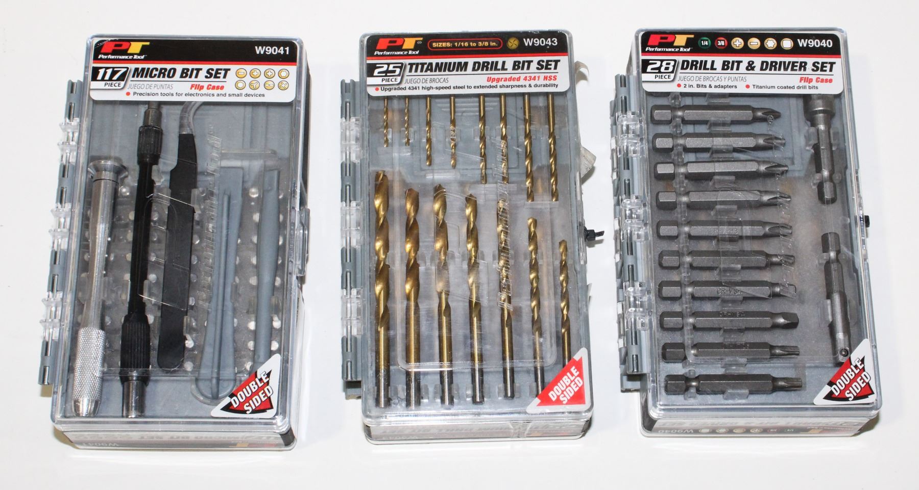 BIT SET, AND PT 28PC DRILL BIT & DRIVER SET. ALL ARE DOUBLE SIDED CASES