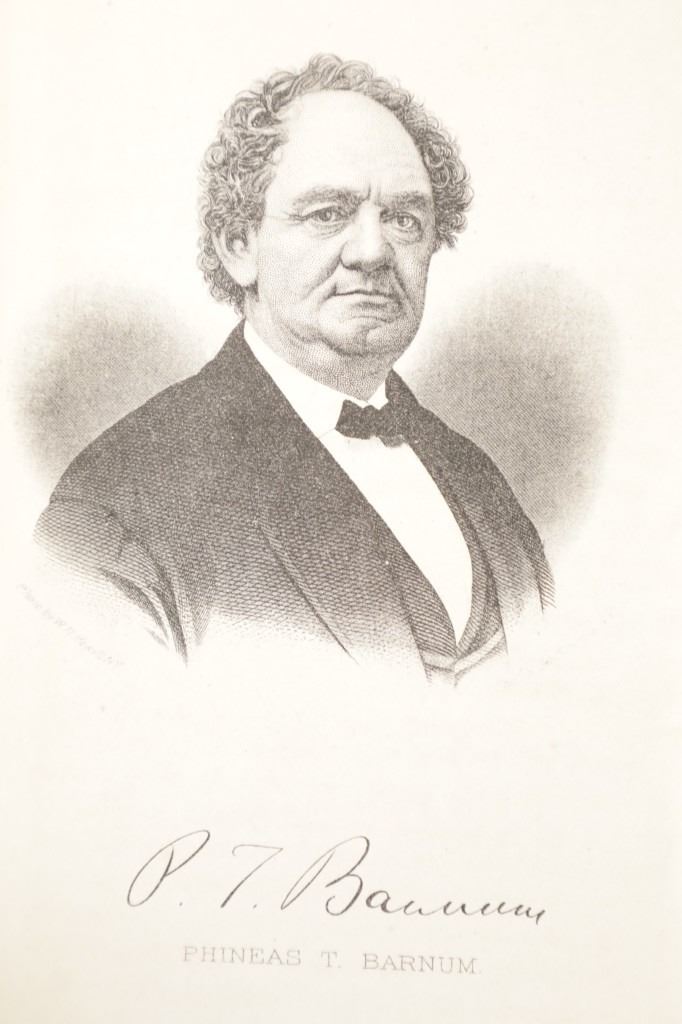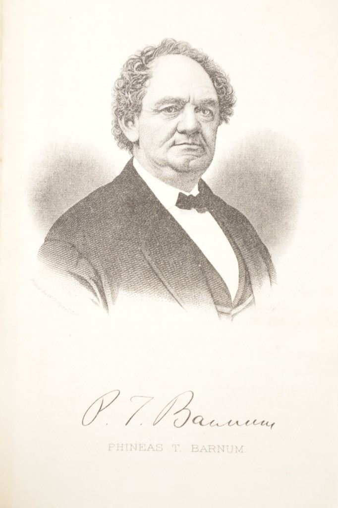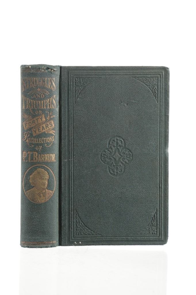 Presented in this lot is P.T. Barnum's "Struggles and Triumphs Or 40 Years' Recollections of P.T. Barnum", Author's Edition, 1872, Warren, Johnson & Company publisher. Written by Phineas T. Barnum himself, this edition of his ongoing autobiography features both sketches and stories from his adventures as a showman and novice circus owner. This memoir recounts the colorful and eventful life of P. T. Barnum (1810-1891), a renowned showman and entrepreneur, detailing his journey from humble beginnings to becoming a significant figure in the entertainment world. The narrative promises to be not only entertaining and filled with anecdotes but also instructive, as it reflects on the lessons of perseverance and resilience in the face of adversity. The opening of the autobiography introduces the author’s early life in Bethel, Connecticut, where he was born into a family of modest means. From a young age, Barnum demonstrated an entrepreneurial spirit, engaging in various small ventures like selling homemade candies and trading goods. He shares amusing tales of his childhood experiences, including a memorable first visit to New York City that left him both exhilarated and disillusioned. Barnum also reflects on the values instilled by his family, particularly his mother's influence and his father's varied pursuits, setting the stage for the challenges and adventures he would face in his quest for success. The green cloth bound gold gilt stamped hardcover is in good overall condition, slight scuffing noted to cover edges. Intact pages exhibit age tanning and foxing throughout. Measures 5.25"W x 7.875"L x 1.375"D, weight is 1lb 6oz.*
