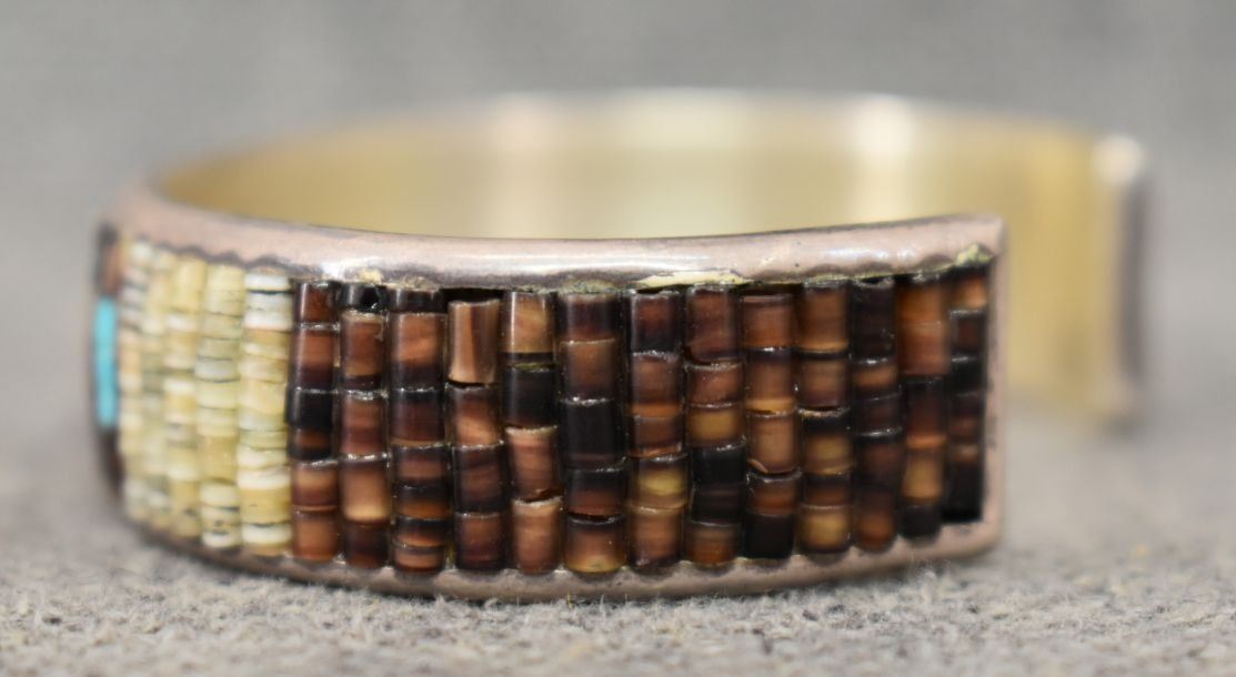 1980's Pueblo. Sterling silver turquoise and shell heishi bracelet signed LC. .5'' x 5.5'' x 1.25''. Total weight 25 grams
