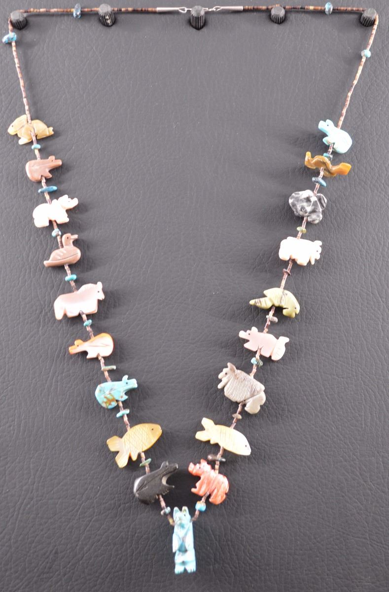 1980's. Shell heishi with turquoise nuggets 30" long. Various stone animal fetishes, largest .5" x 1.25"