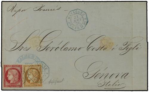 1876 (Aug 31) Entire letter from Mayaguez to Genoa, Italy endorsed ´Vapor Frances´ at upper left, bearing France 1871 Siège 40c. and 1871-75 80c. carmine, slight fault, tied by two strikes of octagonal MAYAGUEZ/PAQ.FR.D.No.2 in blue (Salles 1498): very rare-the unique example cancelling France adhesives. Reverse with Paris transit (Sept 19) and Genoa arrival cds. An exceptional entire of great rarity. Ceres 38,57.