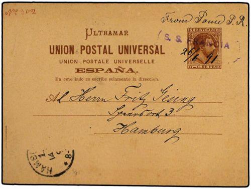 1891 PONCE a HAMBURGO. Entero Postal de 8 ctvos. castaño. Circulado por buque alemán, mat. lineal S.S. FRANCIA y fecha manuscrita ´26/6/91´. Fechador de llegada en el anverso. Rarísimo, UNICO EJEMPLAR que conocemos.