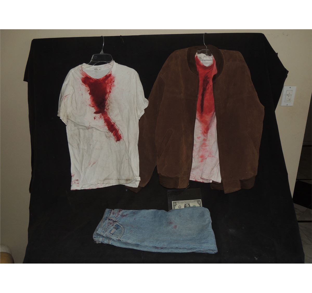 This is the complete wardrobe with 2 different stage bloody Tee shirts, jacket, and jeans from PULP FICTION worn by Bruce Willis in the famous scene with Ving Rhames.